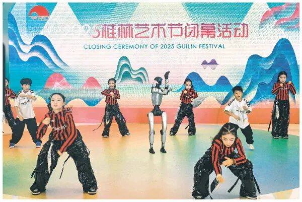 在随后的演出活动中,机器人“桂桂”和“灵灵”惊艳亮相,它们“能唱、能跳、能主持”,还带来了戏曲《定军山》选段。此外,少儿街舞《最好的舞台》、桂剧《山水梨园》、诗词表演《童声里的中国诗》与经典歌曲《山歌好比春江水》等精彩节目与互动游戏,让现场惊叹与掌声不断,绘出了一幅传统与现代交织、人文与科技共鸣的生动艺术画卷。