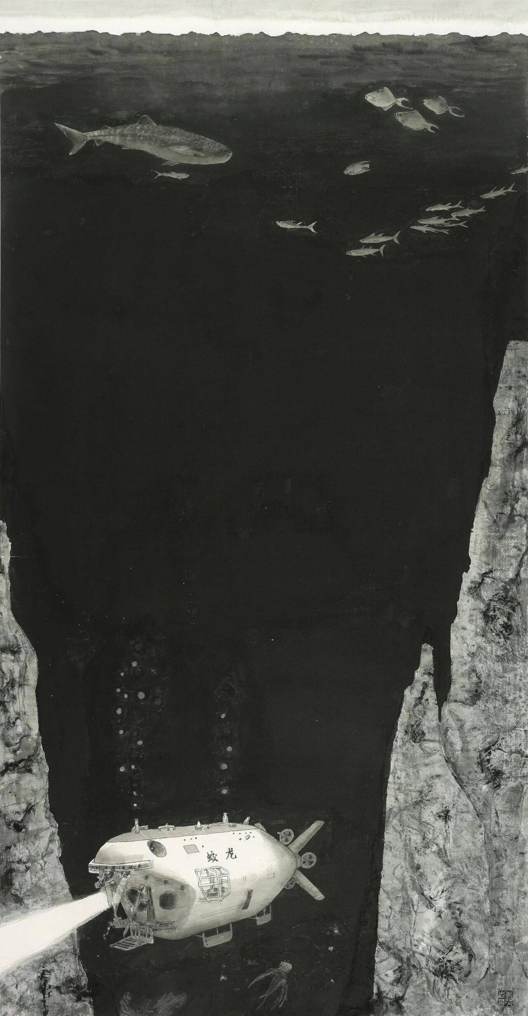 盖会宁多年来游学访问于欧洲、北美、西非、大洋洲、东南亚等地,在汲取东方文化精髓的同时,融合东西方绘画的表现手法,并积极引入当代审美的视觉传达体系。其创作常以太湖石为核心,通过生宣反复涤染,将太湖石的褶皱、孔洞转化为“知白守黑”的极简对比,从微观视角重构江南意象。如《石破天惊》系列以局部细节的极致刻画,将江南文人“以小见大”的艺术传统进行当代转译。抽象与超写实的水墨融合,体现了水墨从传统媒介向多元化当代艺术载体的跨越。