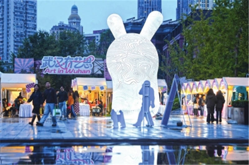 与此同时,系列艺术活动成为城市文旅新名片。自由艺术家杨芾为艺术生活季创作的“Me.U”兔艺术装置以流畅线条模拟武汉的江河脉络与湖泊涟漪,成为平和坊广场打卡热门。“武汉艺术生活诗乐现场”、文化艺术沙龙等活动吸引大家深度参与,外地游客直言“街头偶遇艺术是独特的城市体验。”艺术与历史建筑的融合,让咸安坊、平和打包厂等成为承载人文内涵的新地标。更有游客专门为市集里的非遗手作、艺术文创而来,沉浸式感受江城烟火与文艺气息。“带着‘艺术漫游护照’打卡盖章,像解锁城市艺术盲盒!”平和坊广场,大学生邱妍举着盖满印章的“护照”拍照。自艺术生活季启幕以来,这片充满老武汉风情的街区,凭借“武汉艺术生活漫游计划”,俨然成为年轻人的“艺术游乐场”。从创意市集到艺术画展,从AI互动到City Walk漫游,让青年用熟悉的方式打破艺术参与壁垒。像邱妍一样的众多市民游客边逛展、边盖章、边购物,形成“艺术+文旅”的消费新场景。这种“以艺促旅、以旅兴艺”的实践,为武汉打造建设世界知名文化旅游目的地注入文化内核。