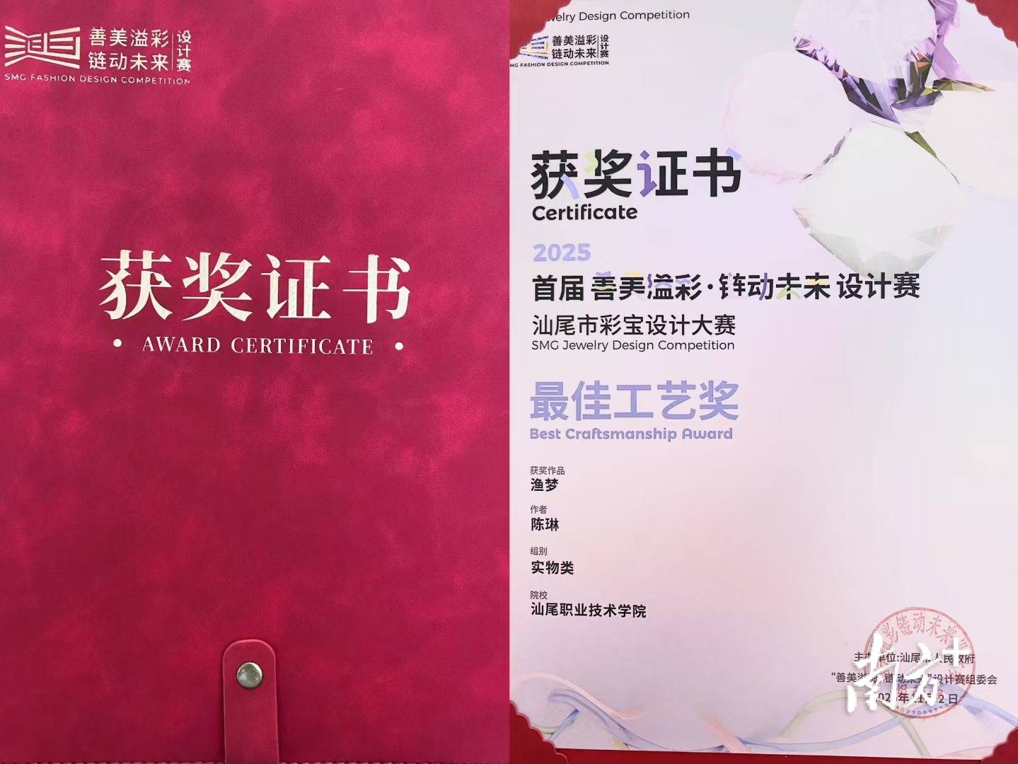 值得一提的是,在展会期间,汕尾职业技术学院老师陈琳的珠宝设计作品《渔梦》,在汕尾市彩宝设计大赛中获得“最佳工艺奖”。
