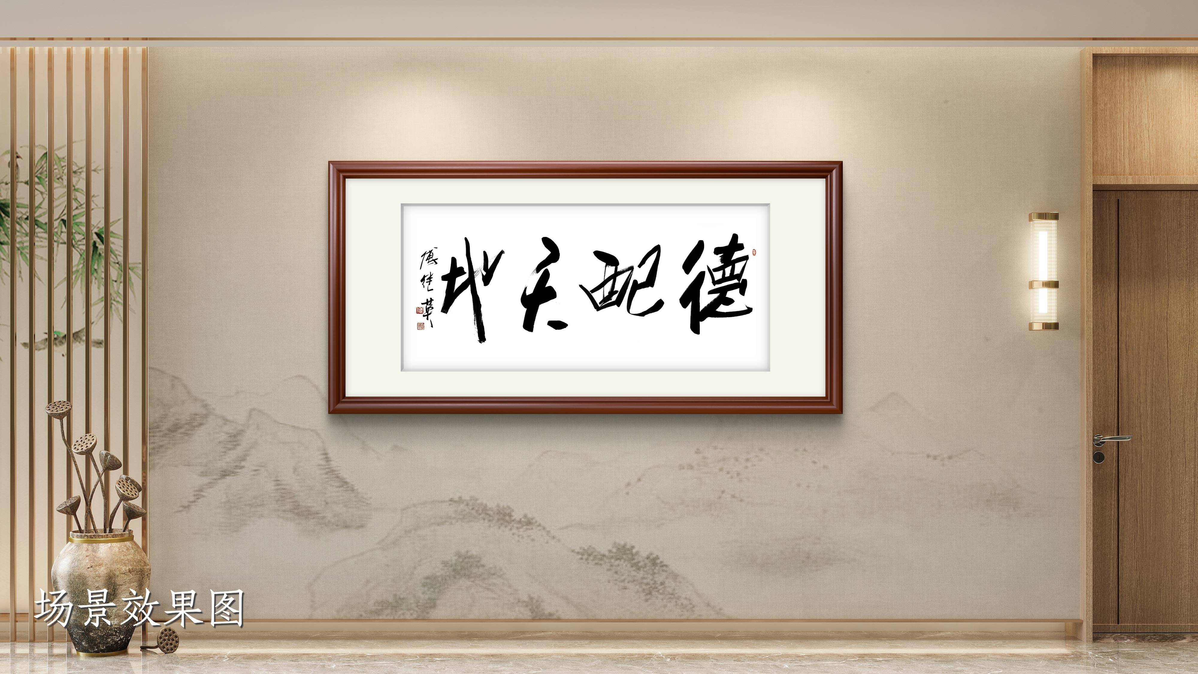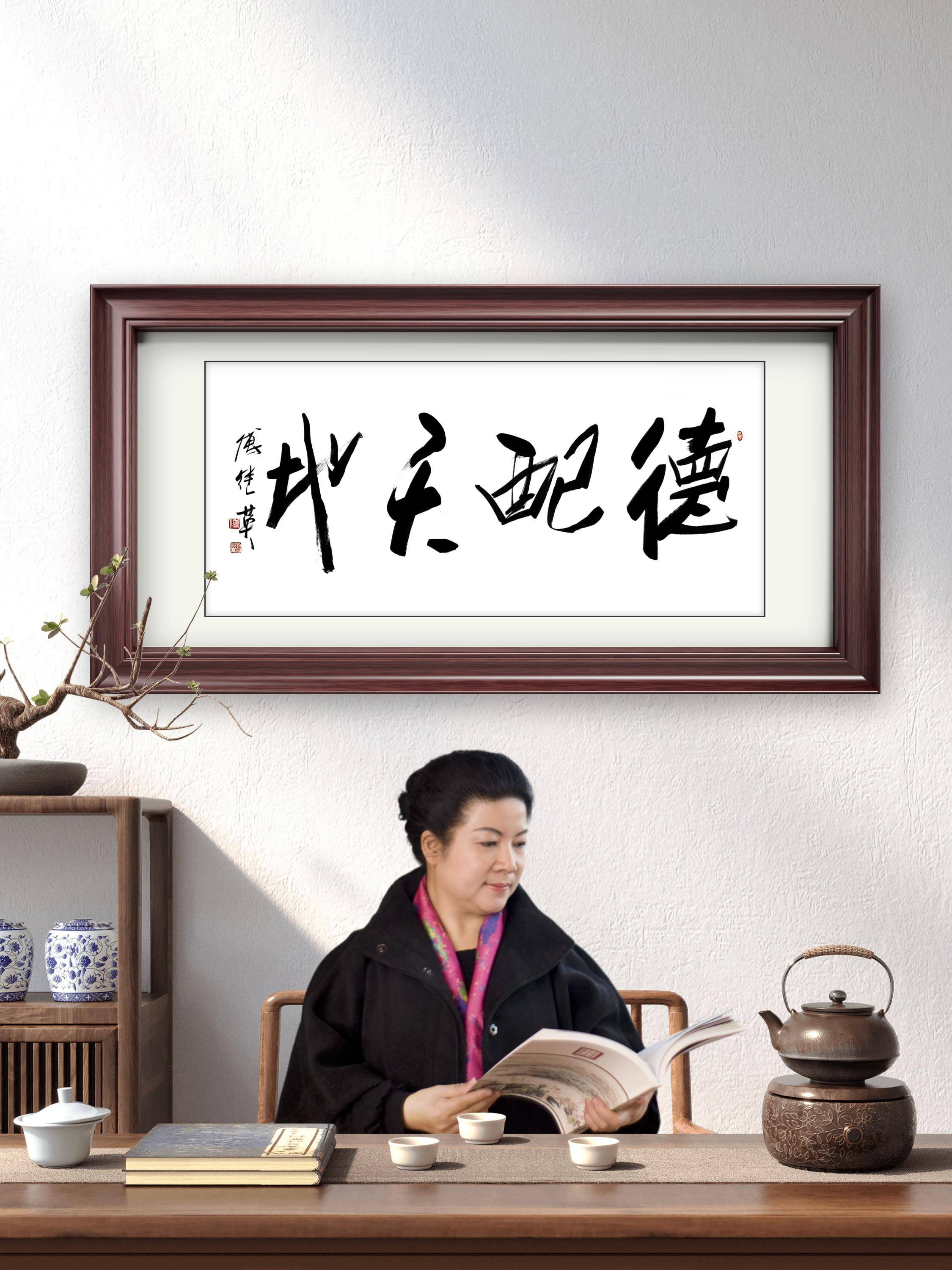 傅继英老师的这幅书法作品,凭借其苍劲有力又不失温润的笔墨,成为诸多场所的精神点缀,不同空间亦因它而彰显独特寓意。在中式书房中,“德配天地” 是主人的自我警醒。书房本是修身治学之地,悬挂此作,便如同将 “立德” 的追求融入读书治学的日常,提笔落墨时见此四字,能让人在钻研知识的同时,不忘涵养心性,时刻以 “与天地同久” 的德行标准要求自己,让书房不仅有书卷气,更有君子之风。