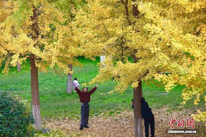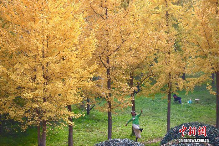 11月4日,位于西安市北郊的大片银杏林由绿转黄,吸引大量市民前来观赏游玩。图为银杏林。中新社记者 张远 摄