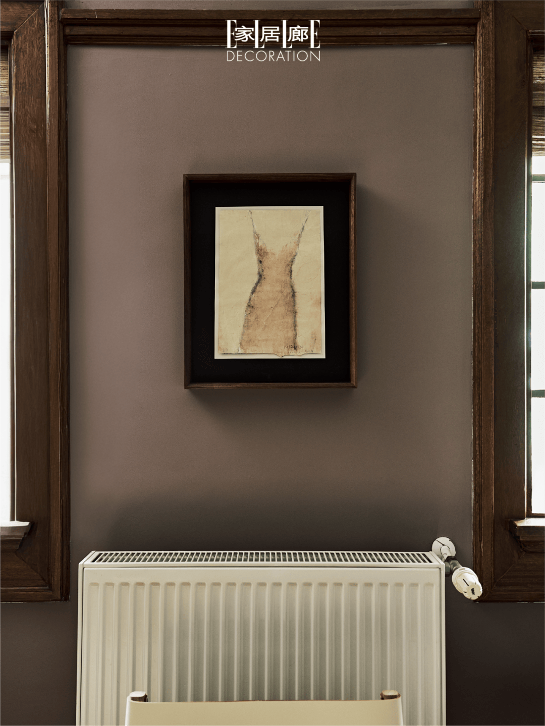 会。书房的整体色调,正是围绕倪志琪的作品而定的。这幅综合材料作品色调偏浅,若搭配常规的白色墙面,难免显得不够突出,因此我在观察了书房的光线同时,提取了他作品中的颜色。特意调整了整个空间的色彩搭配,让作品与环境更好地呼应。朱金石的油画,以极具视觉冲击力的色彩见长。我特意将它置于空间一侧,意在让出更舒展的观赏空间,避免其强烈的存在感挤压视线,让欣赏更显自在。