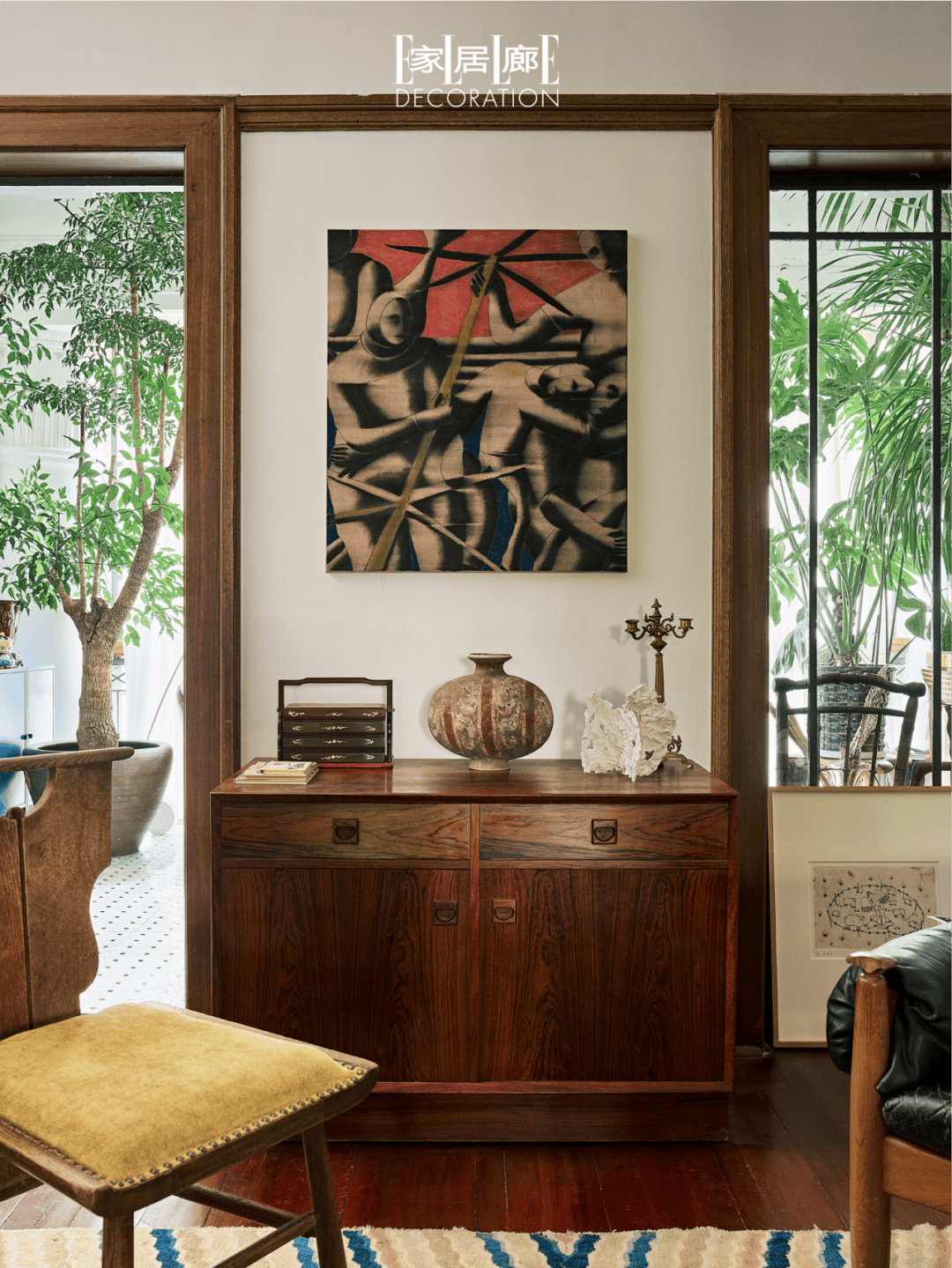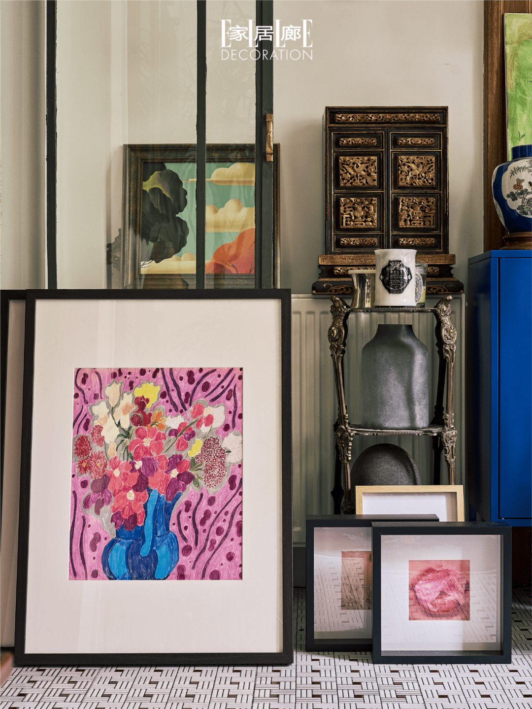 窗台上随意摆放的清代⻘花⼩罐、⽼玻璃灯旁伫⽴的⻄⾮⽊雕、书柜之上错落摆放的物件……李蔓的家中,这些从世界各地带回的物件在生活里自然就位,它们跨越⼭海⽽来,为空间增添⼏分异域的鲜活。每一件艺术品,也都在这个家找到了属于自己的空间、彼此成全。