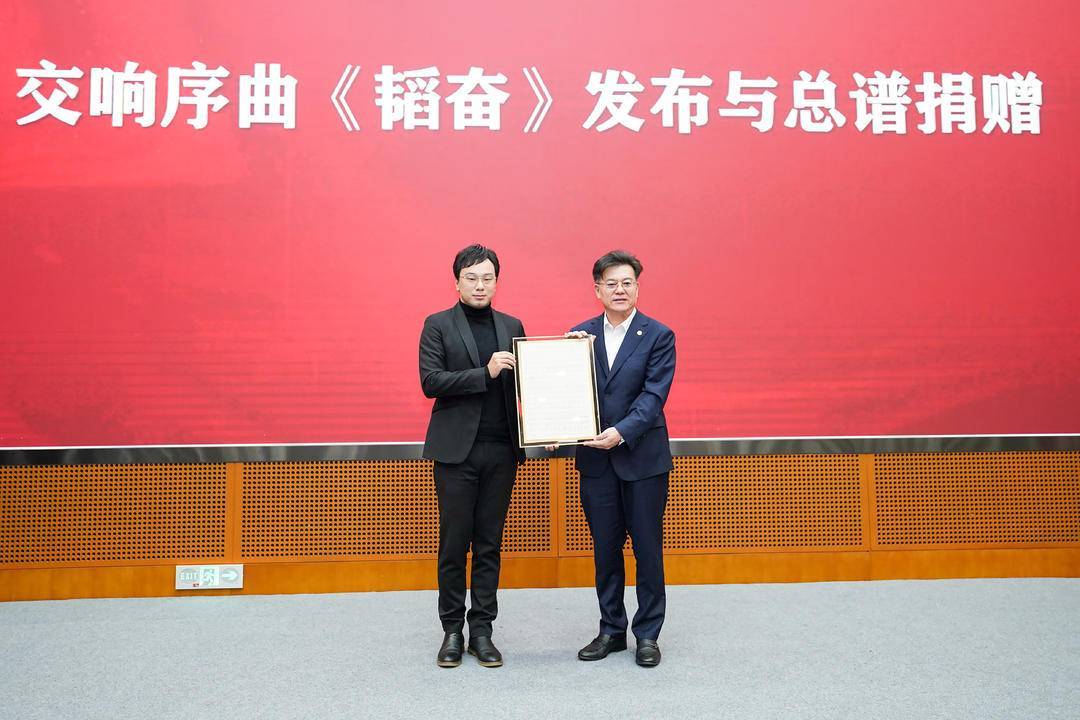 纪念大会上,殷陆君、马笑虹、阚宁辉、杨振斌先后致辞,多项重要成果也相继发布。为纪念邹韬奋先生,青年作曲家罗威谱写了交响序曲《韬奋》,以旋律致敬先贤;青年歌唱家张帆涛用歌声演绎韬奋先生信仰的力量与光芒。这份凝结着敬意与才华的作品,其总谱正式捐赠给上海交大,为传承韬奋精神增添了鲜活艺术载体。于朝阳代表交大接受总谱捐赠。