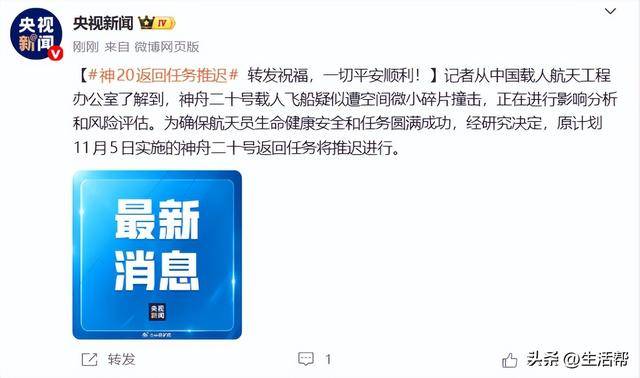 为确保航天员生命健康安全和任务圆满成功,经研究决定,原计划11月5日实施的神舟二十号返回任务将推迟进行。
