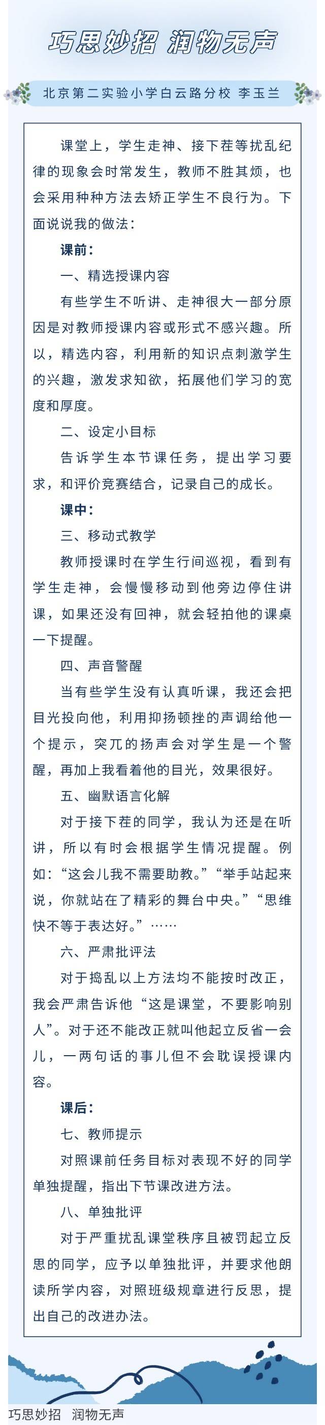 活动期间,我们收到了班主任们的踊跃投稿。从一句巧妙的提醒到一个默契的暗号,从一次积极地强化到一场深入的谈心……老师们笔下的每一个“小妙招”,都蕴含着对学生的深刻洞察与对教育时机的精准把握。这些案例,既是行之有效的方法集锦,更是教育智慧与师者仁心的真实写照。