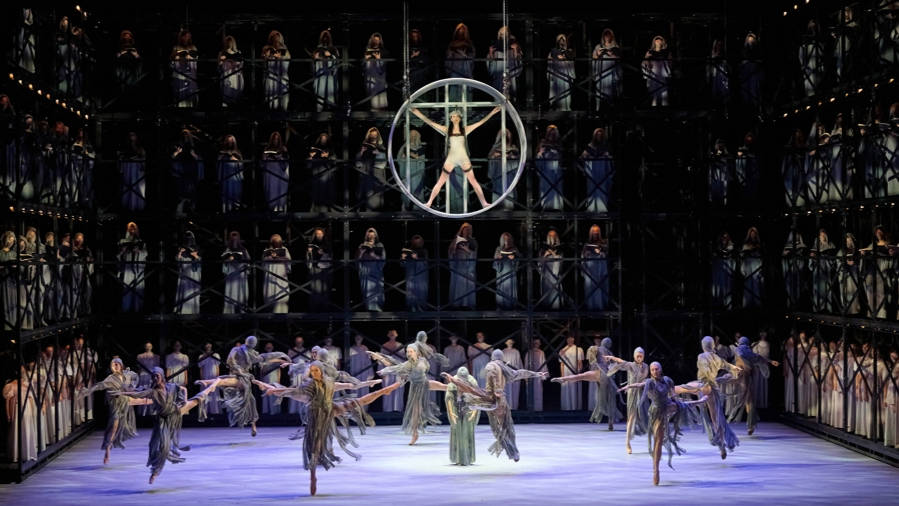 视觉呈现是港芭版《布兰诗歌》的亮点之一。悬于舞台中央高处的轮盘上,舞者以伸展四肢的体态站立其中,仿佛《维特鲁威人》的复刻,这样的画面正与《布兰诗歌》开篇名作《哦,命运》中的“命运之轮”不谋而合。在环绕舞台的8米高台上,上海音乐学院合唱团与春天少年合唱团的歌者们,将与香港管弦乐团共同带来视听双重震撼。