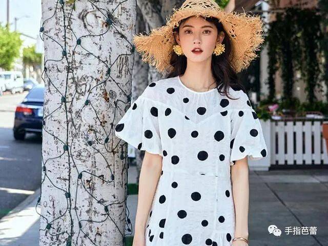 提到复古风,就不得不提波点元素了。波点名字起源于19世纪中期流行的一种舞蹈polka,寓意是小女孩,活泼的白色圆点在各种底色,不同裁剪版型的衣服上跳跃,像一个小女孩在舞蹈,所以衣服中糅合波点元素,除去给人带去复古的风情之外,还更能体现女生的活泼可爱。