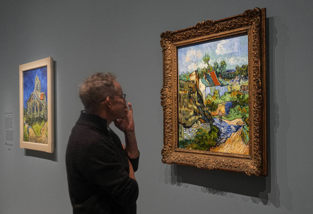当地时间2023年9月29日,法国巴黎,在奥赛博物馆举办的“瓦兹河畔奥维尔的梵高:最后的岁月”预览会上,一名男子在观看梵高1890年的布面油画《瓦兹河畔奥维尔之家》。视觉中国资料图