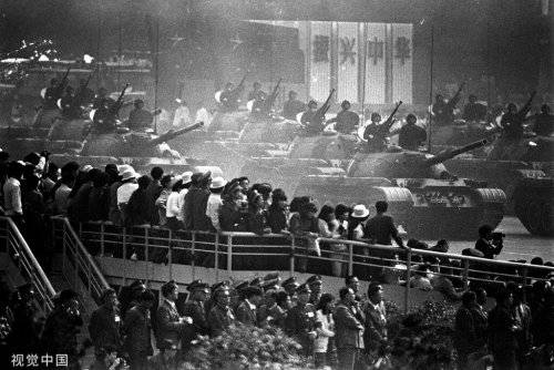 1984年10月1日,北京,国庆35周年,北京天安门前观礼台的特约代表观看阅兵式。