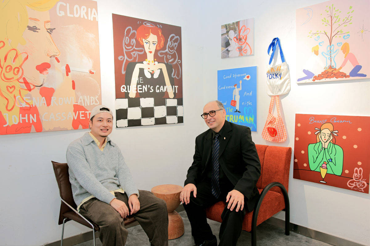 图为中国艺术家杨昌溢(左)和匈牙利艺术家图兹松·贝采利·彼得(右)交流。香港维岸画廊供图