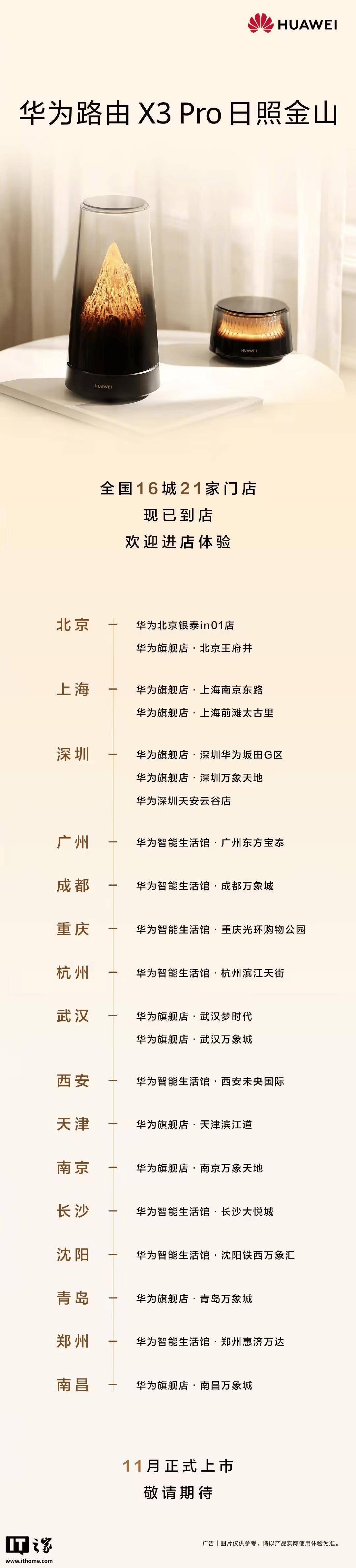 悬念在 10 月 21 日揭晓,余承东正式公布这款“日照金山”新品即为华为最新款路由器华为路由 X3 Pro,随后的 10 月 30 日,该新品无预警“空降”上海前滩太古里华为旗舰店,极具颠覆性的外观设计引来了众多消费者驻足围观。