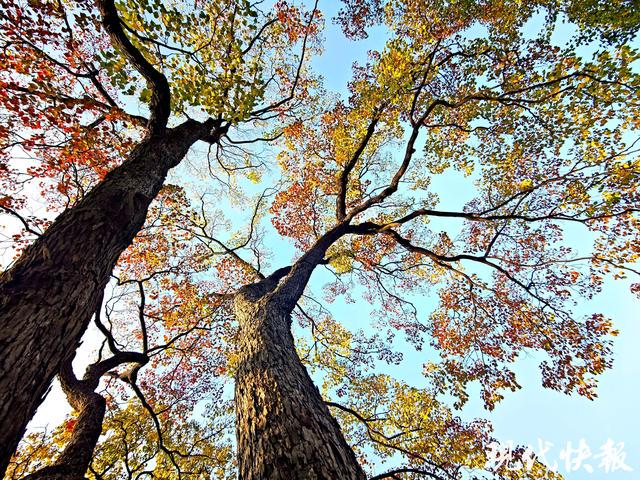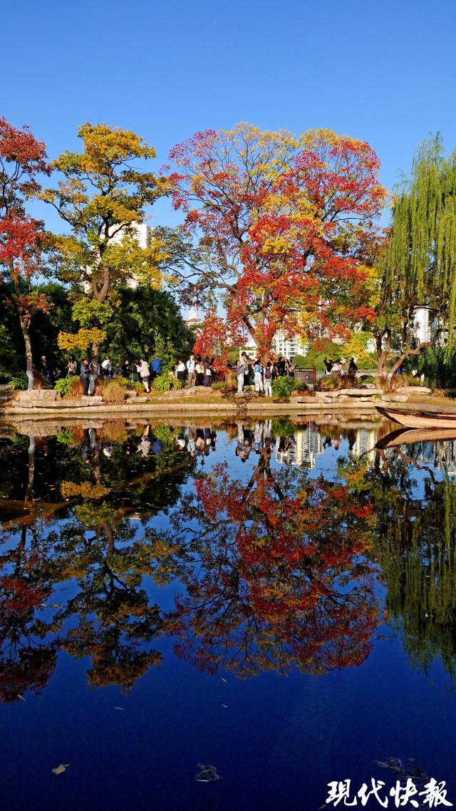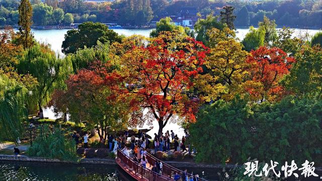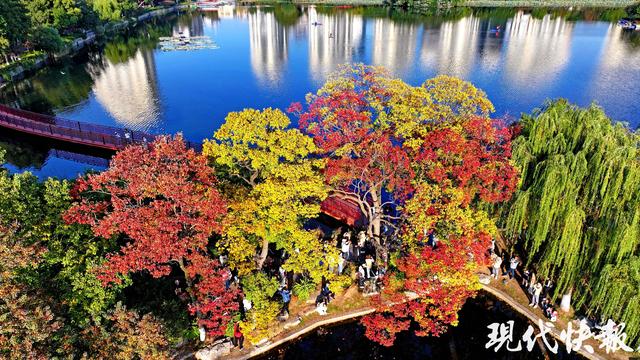 现代快报讯(记者 卢河燕/文 赵杰/摄)11月的南京,秋意渐浓,整座城市被层层叠叠的暖色包裹,愈发绚烂多彩。南京莫愁湖景区内,一棵棵乌桕临水而立,浅黄、橙黄、青绿、鲜红、暗红的叶片交织错落,将湖畔秋色演绎得淋漓尽致,成为市民游客追捧的“秋日网红”。