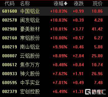基本金属板块表现强势,中国铝业、闽发铝业、豪美新材、常铝股份、南山铝业涨停,云铝股份、焦作万方涨超8%,神火股份、中孚实业等跟涨。