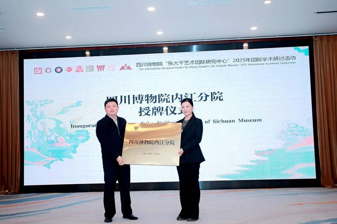 值得一提的是,活动现场,四川博物院内江分院正式授牌成立,四川博物院党委书记向和频向内江市张大千纪念馆代表王鼎授牌,这标志着两大文博机构合作关系的深化,通过资源整合与优势互补,共同搭建起一个更高层次的张大千艺术研究、展示与传播平台,对于推动区域文化艺术协同发展具有深远意义。此外,《石壁丹青:张大千临摹敦煌壁画集》《张大千艺术研究(第一辑)》《大千敦煌——敦煌笔记》三部著作也在现场集中发布。