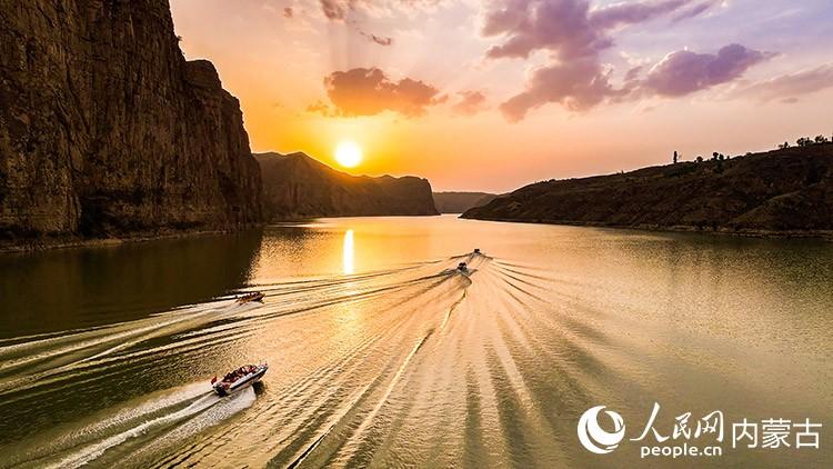 夕阳下游船在老牛湾黄河大峡谷驶过。王劭凯摄