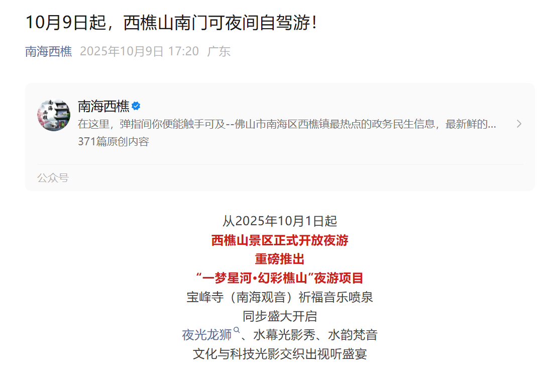 此时,距西樵山开放夜间自驾游项目,仅过去1个月不到。