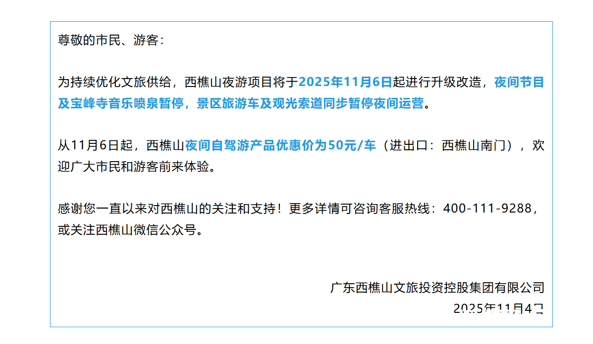 11月4日,广东西樵山文旅投资控股集团有限公司公告称,西樵山夜游项目于11月6日起进行升级改造,夜间节目及宝峰寺音乐喷泉暂停,景区旅游车及观光索道同步暂停夜间运营。