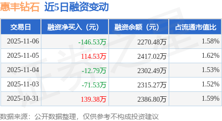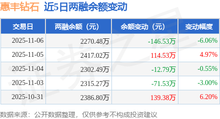 证券之星消息,11月6日,惠丰钻石(920725)融资买入385.39万元,融资偿还531.92万元,融资净卖出146.53万元,融资余额2270.48万元,近20个交易日中有11个交易日出现融资净买入。