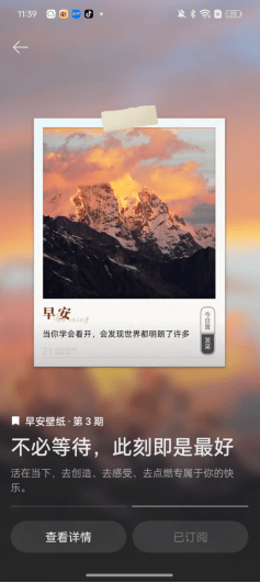 针对晨起、晚间等不同时段,乐划锁屏推出“早安壁纸”“入梦书单”等场景化内容,支持一键订阅。每日早晨自动推送精美壁纸与问候卡片,将唤醒变成充满期待的美学仪式。后续还将上线【壁纸】频道,满足用户更多需求。