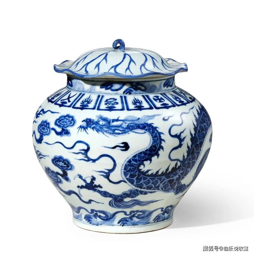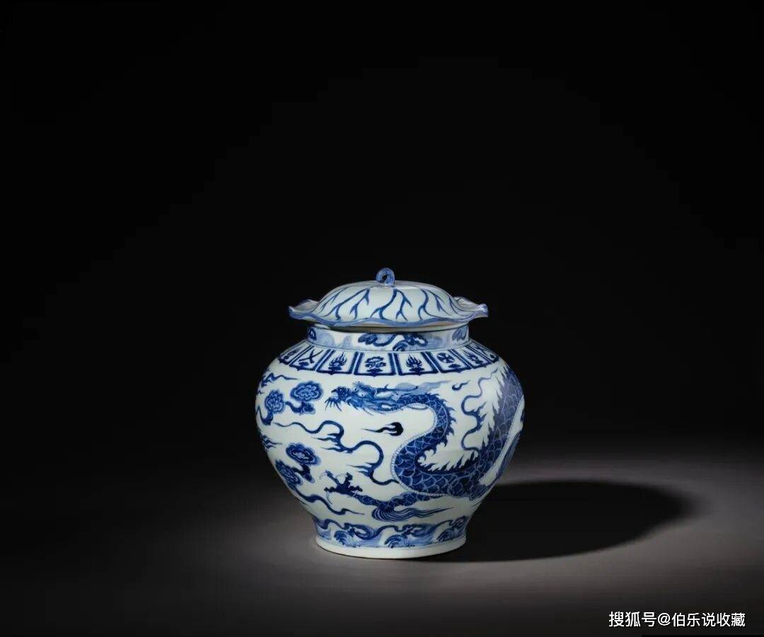 此式龙纹仅见于元代(1271-1368年)青花珍品,绘之者存量寥寥,本件当属翘楚一例;青花巨龙环绕罐身,尽显威仪,荷叶式盖举世稀见,平添清致,堪称元代艺术之经典。此龙超凡入圣,气韵与大英博物馆中大维德收藏对瓶所绘旗鼓相当;考铭文可知,大维德对瓶于1351年成器,瓶身龙纹冠绝中国陶瓷。细品笔意及局部细节,本罐龙纹与大维德对瓶如出一辙,几可推定为同手所绘。