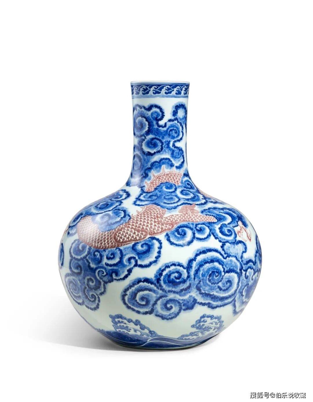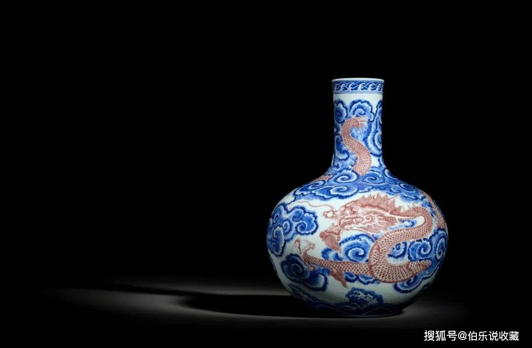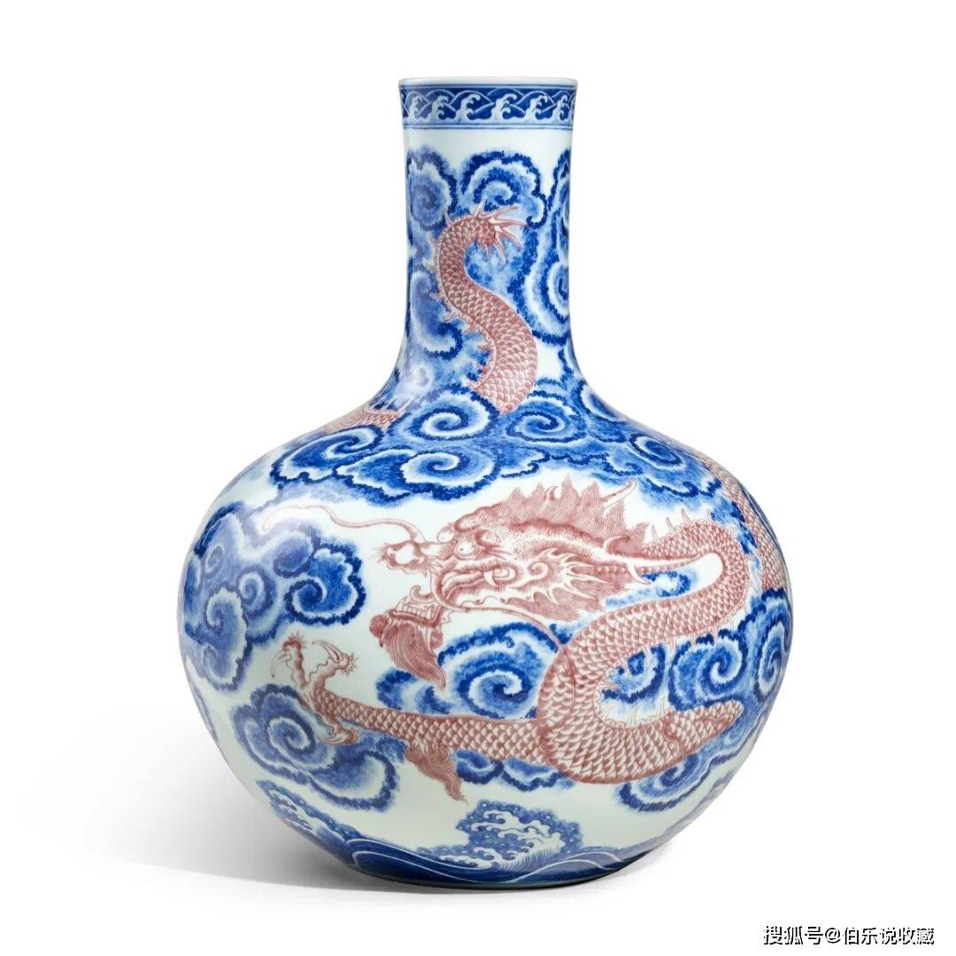 乾隆青花釉裡红天球瓶,龙纹磅礡,气势万千,融合中国数千年的审美传统与江西景德镇御窑厂代代相传的造瓷巧艺,实为中国艺术经典之绝作。本瓶问世之前,固然无缺各式瓷器龙纹,釉裡红游龙搭配青花瑞云者亦自成一脉,早明已有类例,作于较小器形,惟甚罕,或因釉裡红烧造至艰,罕得足以达到御窑标准之成器。天球瓶器形,亦源自明初,得益于制瓷技术进步,遂能成功烧造大型立件。