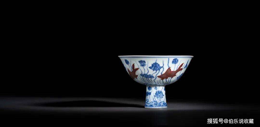 此珍罕高足碗堪称景德镇工匠技艺与美学的双重巅峰。四尾浓艳的绯红游鱼悠然穿梭于澄澈的蓝彩莲池,完美诠释了道家崇尚的自由无羁之境。这一纹样自公元前四世纪庄惠濠梁之辩起,便成为宋元以降文人画与瓷绘的经典题材。然直至景德镇掌握多彩釉技前,鱼藻纹皆以单一青花呈现。而本品独创的铜红釉与钴蓝釉交织技法,终使这一经典纹样达到空前绝后的视觉震撼。