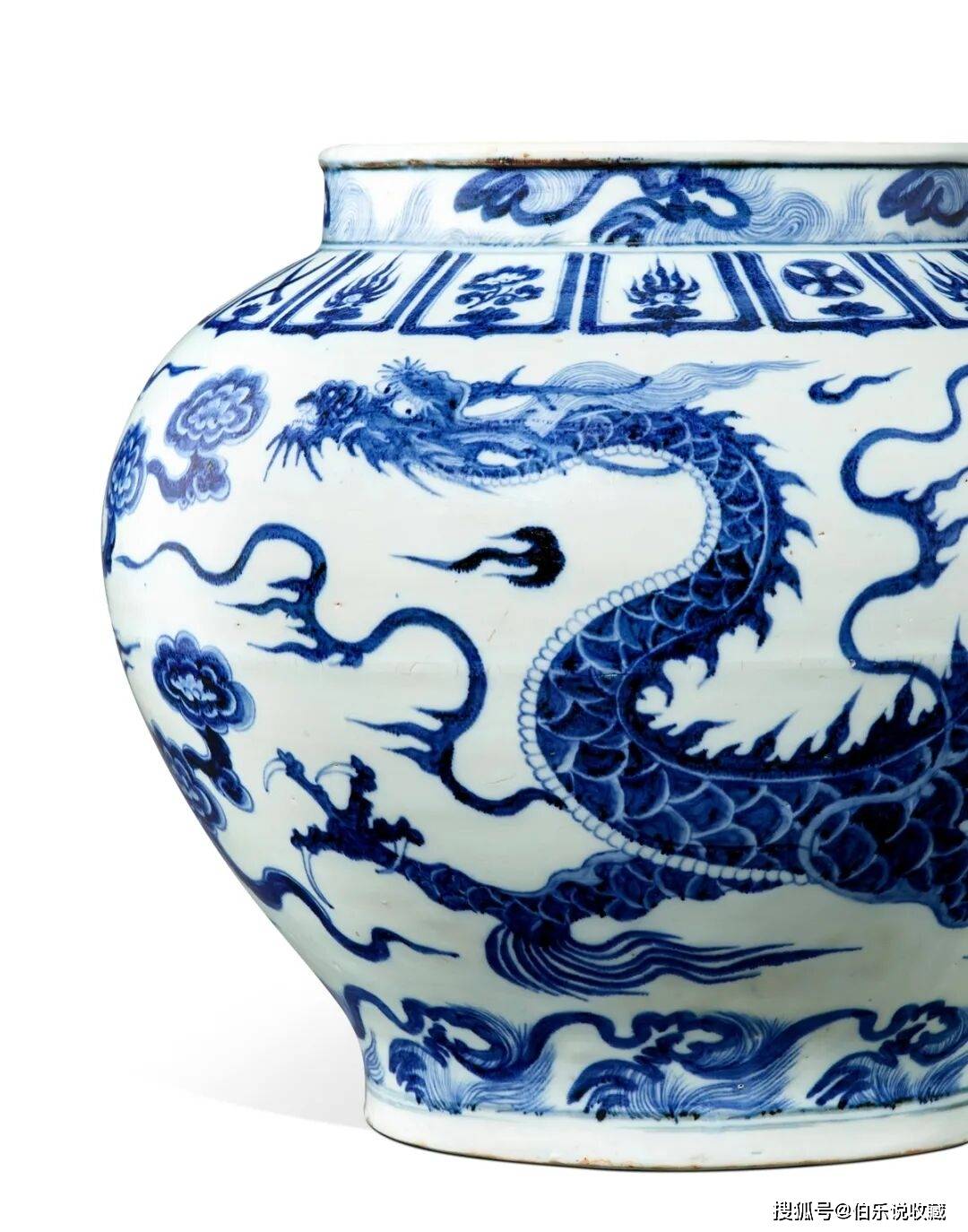 大维德对瓶之一1935年售于伦敦苏富比,本罐龙作四爪,身形雄健,龙鳞以青料逐片晕染,边线留白,腹下点珠为饰,背棘状若熛焰,各分三股,长短不一,种种皆与大维德对瓶一致。龙鬃刻画纤毫毕现,迎风飘扬之态与昂首曲颈相应,此为同类龙纹所罕有,大维德对瓶亦不得见。