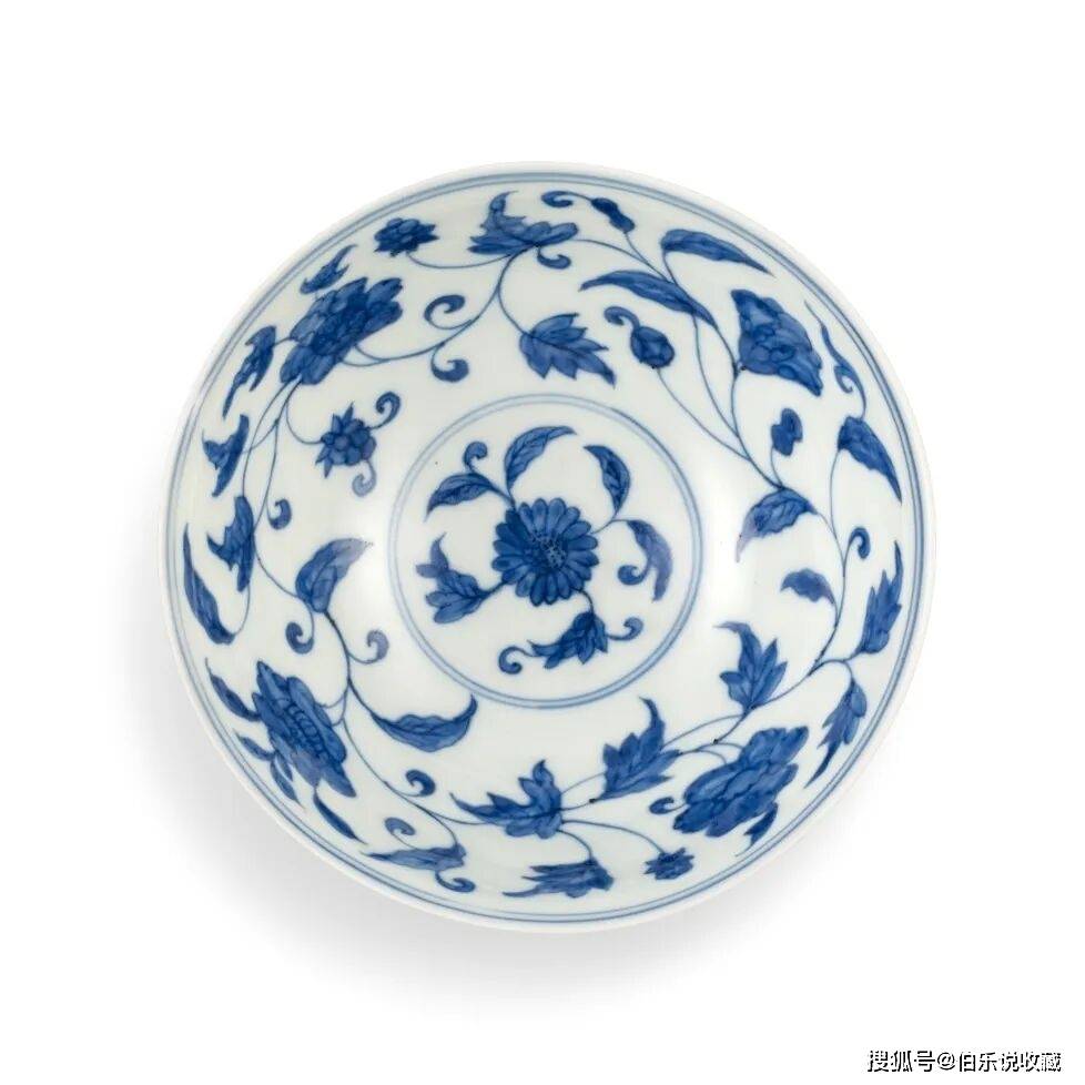 本品以明快钴蓝彩自由绘就繁花硕果纹样,实乃备受推崇的宫廷御制瓷器典范。其大胆的斗笠形碗壁隐约可见花叶轮廓,此造型承袭自宋瓷传统器型。
