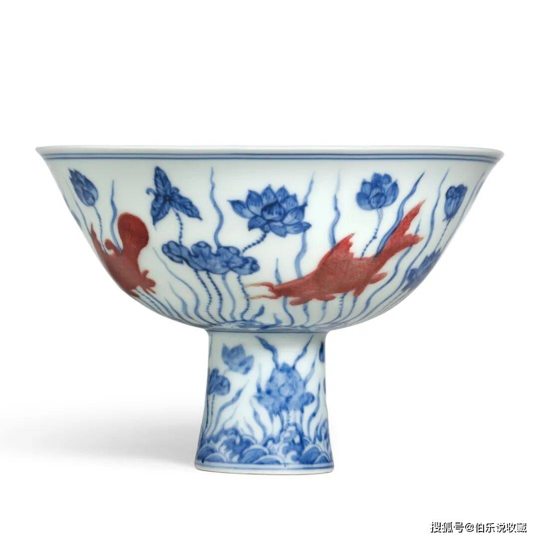本次专场的焦点拍品包括:清乾隆青花釉裡红云龙纹天球瓶,以及明成化青花釉裡红鱼藻纹高足碗,堪称景德镇工匠技艺与美学的双重巅峰。四尾浓艳的绯红游鱼悠然穿梭于澄澈的蓝彩莲池,完美诠释了道家崇尚的自由无羁之境。这一纹样自公元前四世纪庄惠濠梁之辩起,便成为宋元以降文人画与瓷绘的经典题材。然直至景德镇掌握多彩釉技前,鱼藻纹皆以单一青花呈现。而本品独创的铜红釉与钴蓝釉交织技法,终使这一经典纹样达到空前绝后的视觉震撼。