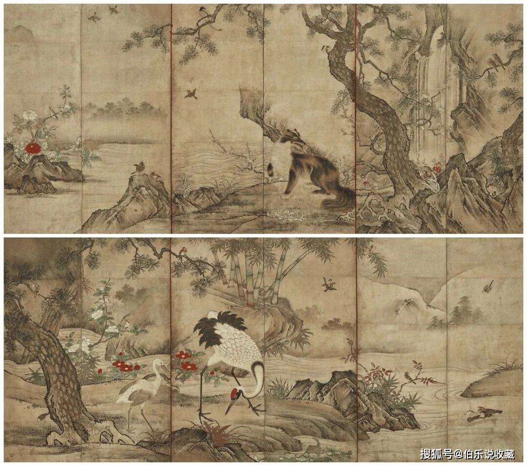 本作构图精妙,寓意祥瑞:右幅绘飞瀑直泻,苍松红梅掩映,岸边灵狸悠然自得;左幅则见青竹山茶,松鹤延龄,众多水禽小鸟和鸣共处,一片生机盎然。此和谐盛景,极可能为庆贺婚禧等吉庆盛典而制,寄托美好祝愿。其笔法精炼,气韵高华,可与大德寺大仙院元信名作《四季花鸟图》障壁画并驾齐驱,堪称馆藏级别之传世瑰宝。