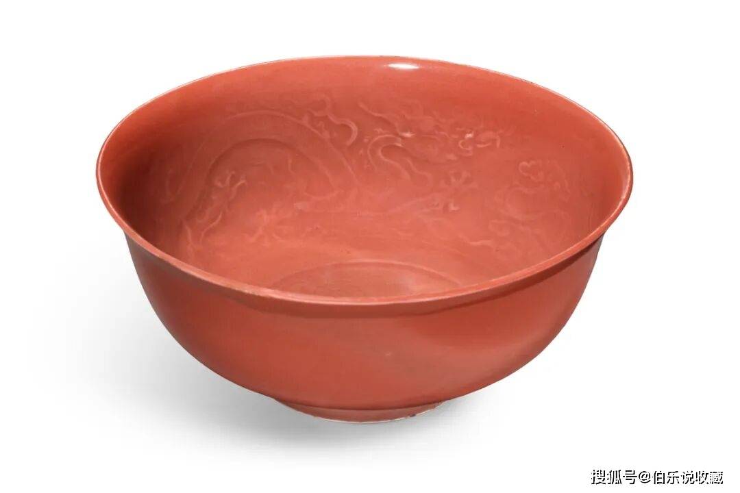 此红釉印云龙纹大碗属极罕品类,乃有明一代最早专为仪礼烧造的御用红釉器之典范。铜红釉素为中国陶瓷史中最具技术挑战之品种。元代虽已试烧,然呈色极难掌控。洪武朝之铜红釉器釉色柔润且略呈斑驳粉韵,独具本朝特色,盖因窑内还原气氛多变,加之铜料于高温下反应无常所致。其红有别于永宣时期所臻明艳朱红,亦与元代多见之深沉褐红迥异。