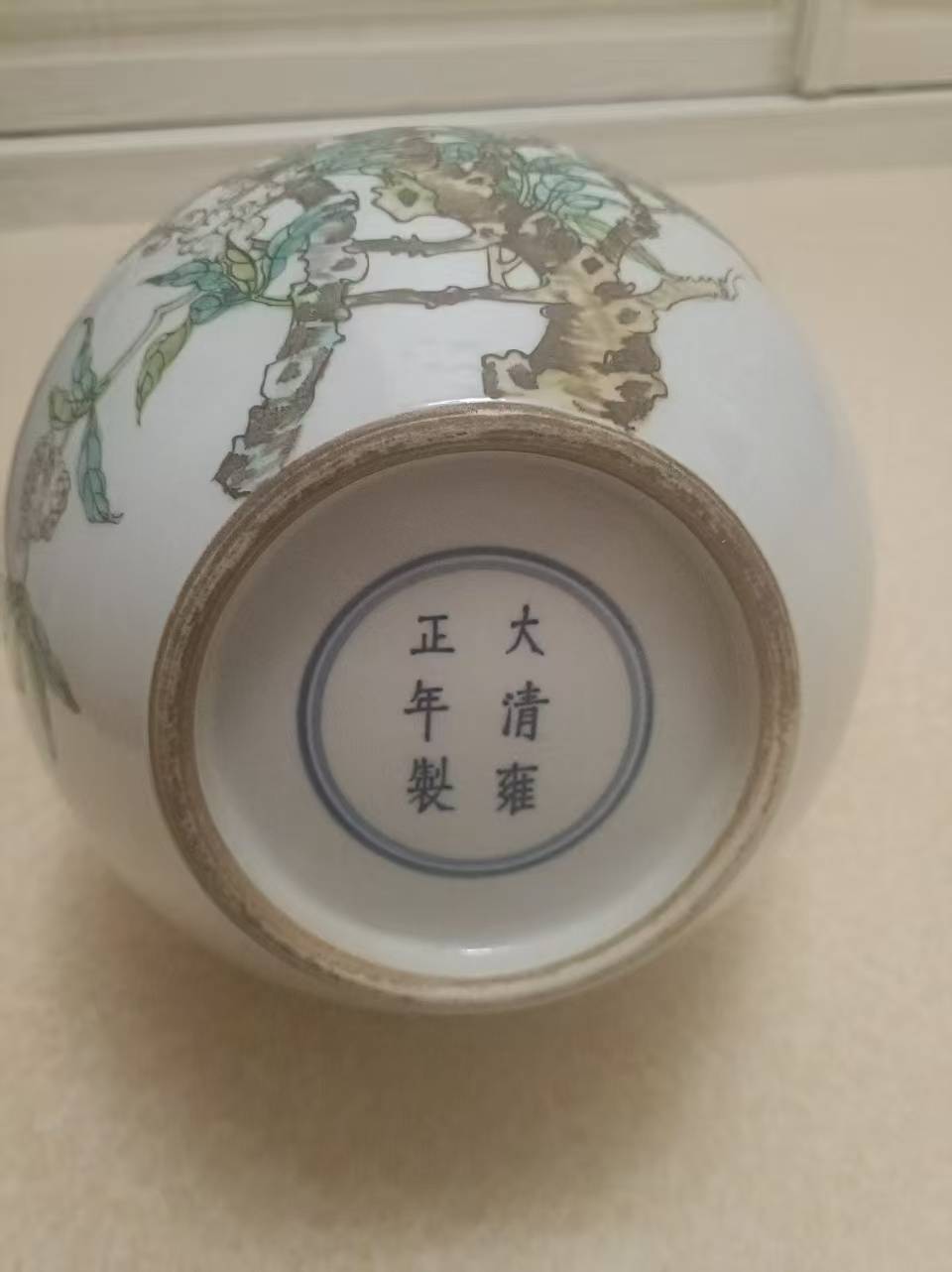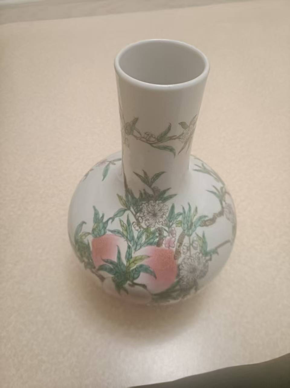 - 胎釉精良:雍正瓷素有“瓷胎莹润,釉质如玉”的美誉。九桃天球瓶的胎体淘洗精细,致密坚硬,重量匀称。其釉面纯净无瑕,白中微微泛青,如同凝脂,为粉彩纹饰提供了绝佳的“画布”。