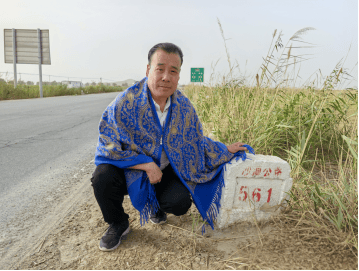 【图片↑诗人2025.09.07驾车穿越塔克拉玛干暨塔里木沙漠公路时在561公里碑处留影】