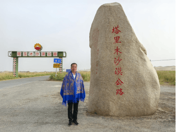 【图片↑诗人2025.09.07驾车穿越塔克拉玛干暨塔里木沙漠公路时在入口处碑铭留影】