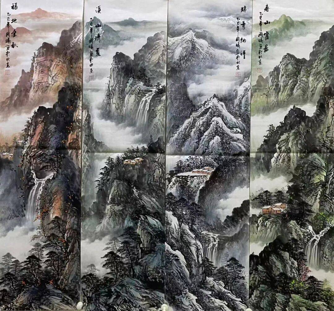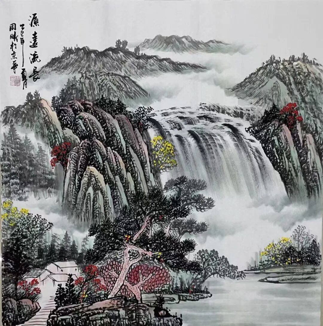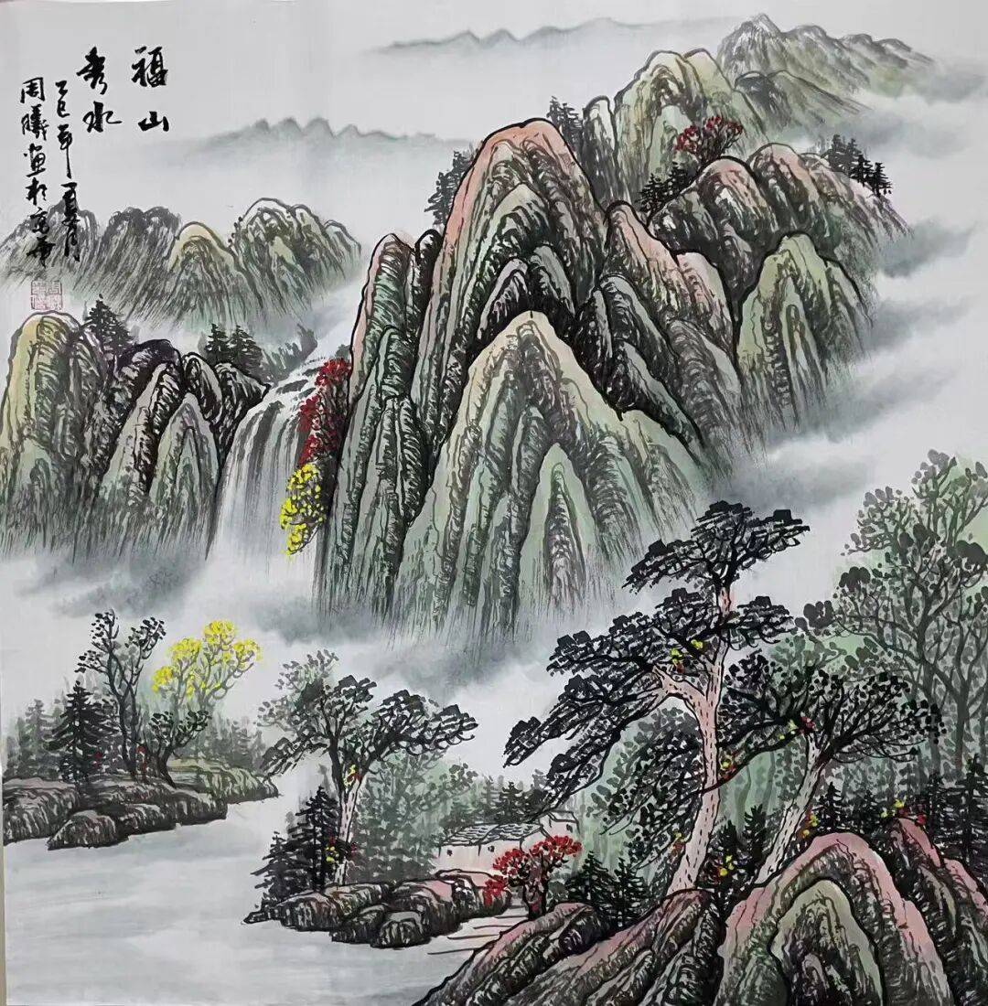 从中国传统文人视角来看,山水是放空自我精神,吐纳胸中气魄的地方。这与花鸟抒情达意的特质,是有着区别的。前者更在于散怀抱,而后者更倾向于蕴情愫。所以欣赏周曦先生的山水画作,很大程度上也是能感受到他的文人格调与精神达观。古人云:“运笔古秀,着墨飞动,望之元气淋漓,恍对岚容川色,是为真笔墨。”看周曦先生山水,方知此言不虚,多年游历山水真迹,种种神韵,皆在自然中汲取得来。笔之皴法,浑厚苍润,只见运思挥毫间,便将险峰叠嶂之势、云雾弥漫之境,在画中徐徐铺展而来。此一幅《春山富水》图,正是以春山烟云连绵人欣欣之景为主,青山葱郁,云水洗练,泉水于丘壑山涧中湍急而下,民居于薄雾草木中若隐若现,远则目视叠嶂幽深,近则一睹灏素之容,如此情景,自能令观者目注神驰!