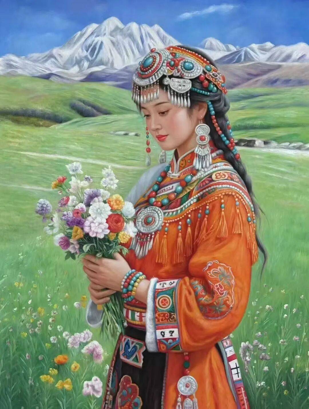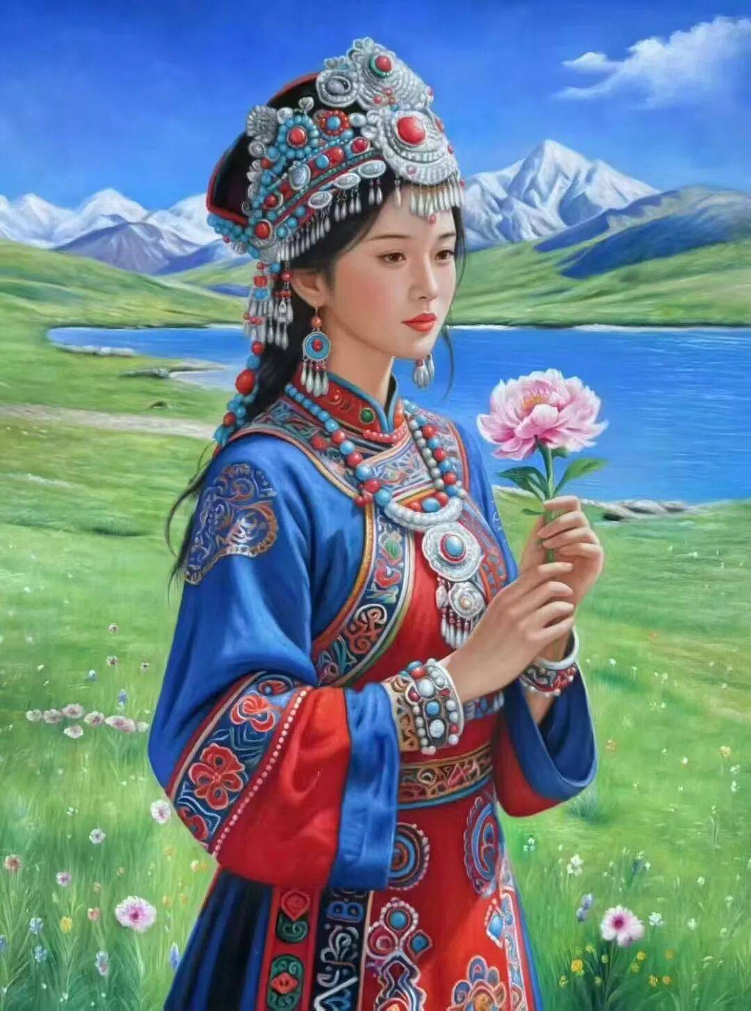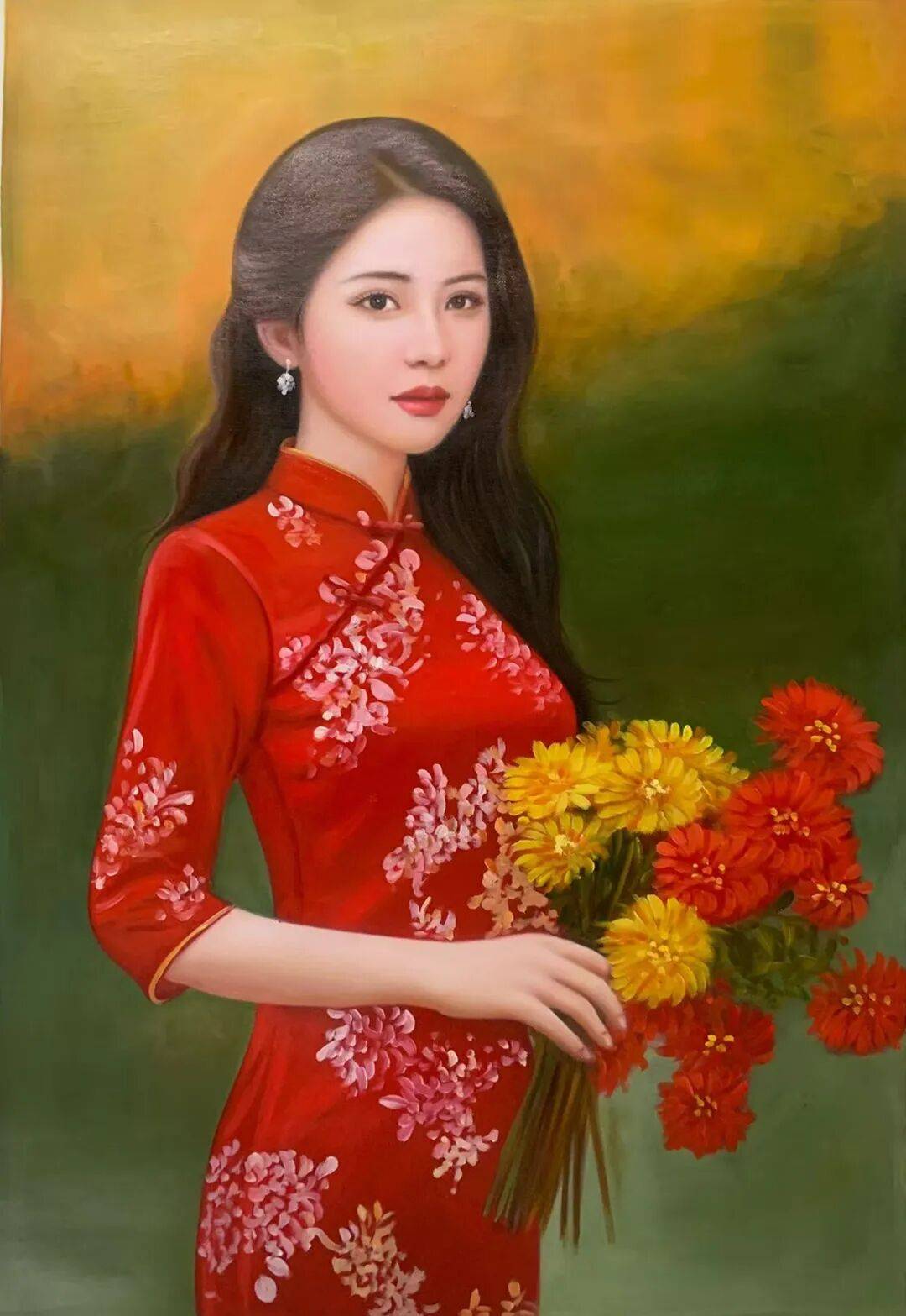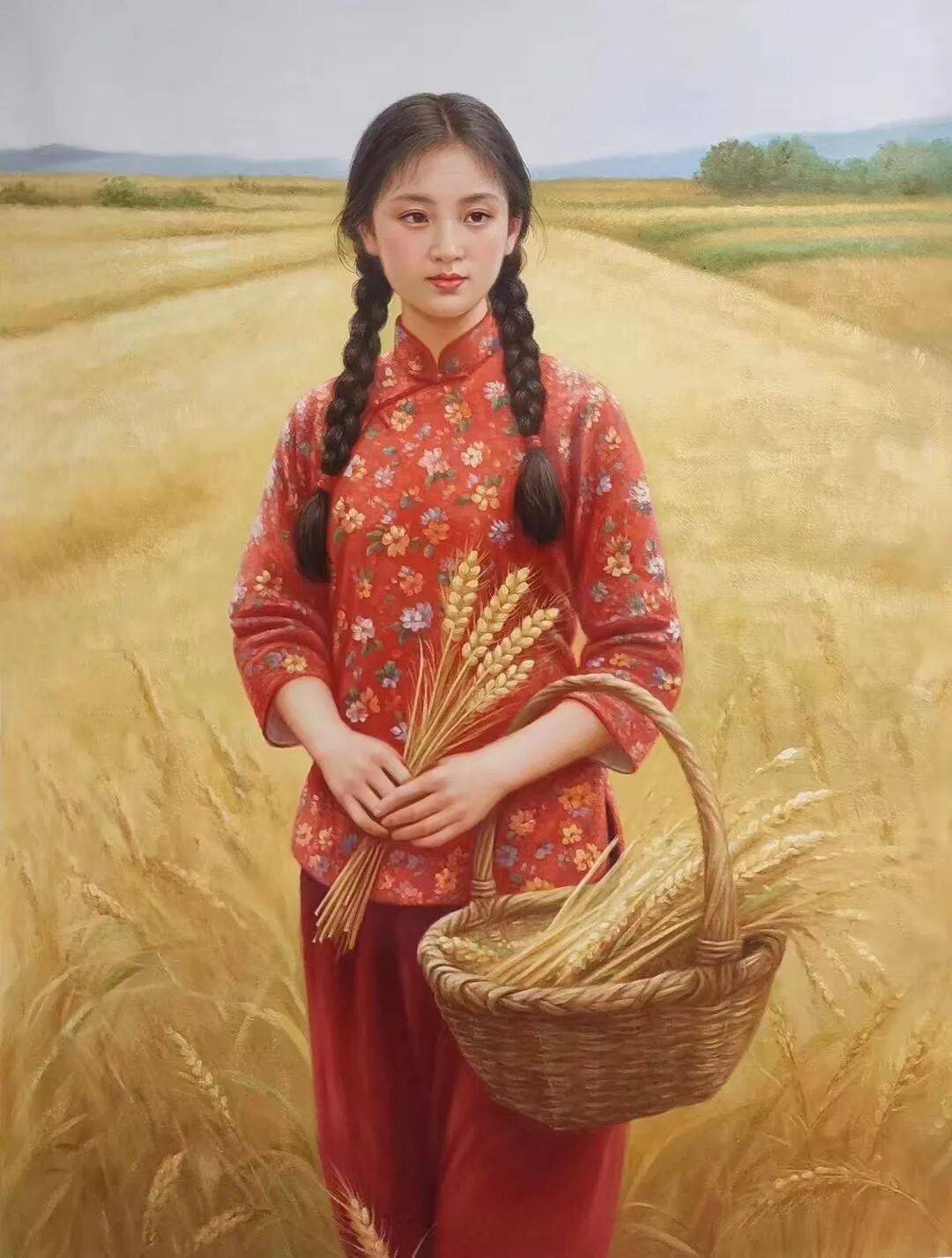 在油画领域,周曦的女子人物画是既有专业的写实素养,同时又能根据人物造型,来传递出丰富各异的女性美。诸如田园之淳、知性之雅、民族之韵、戏曲之粹,皆在其列。画中女子形象,也皆是眉清目秀而无半点瑕疵,体态亦是匀称自然。例如这几幅手持荷花的少女图,现代女子的时代美,在周曦先生的笔下可谓是一览无遗,少女的那种天然感,更是纯粹的、纯洁的、朴素的。掺不得半点俗媚,在恬静的外表下,眼眸又是如此的清澈真诚,满含着宁和之气。再加上整幅画面的氛围塑造,更使得作品极具于情感表现力。有血有肉,至纯至善,而这种将唯美感贯穿始终的创作精神,也是间接反映出了周曦先生自身的艺术魅力。