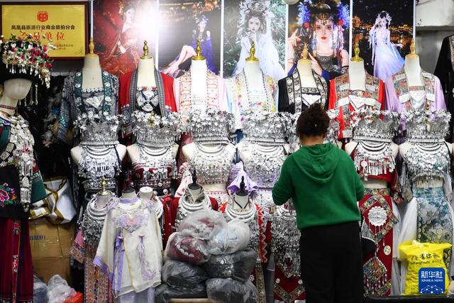 11月6日,游客在凤凰古城一家旅拍店内准备着装。
