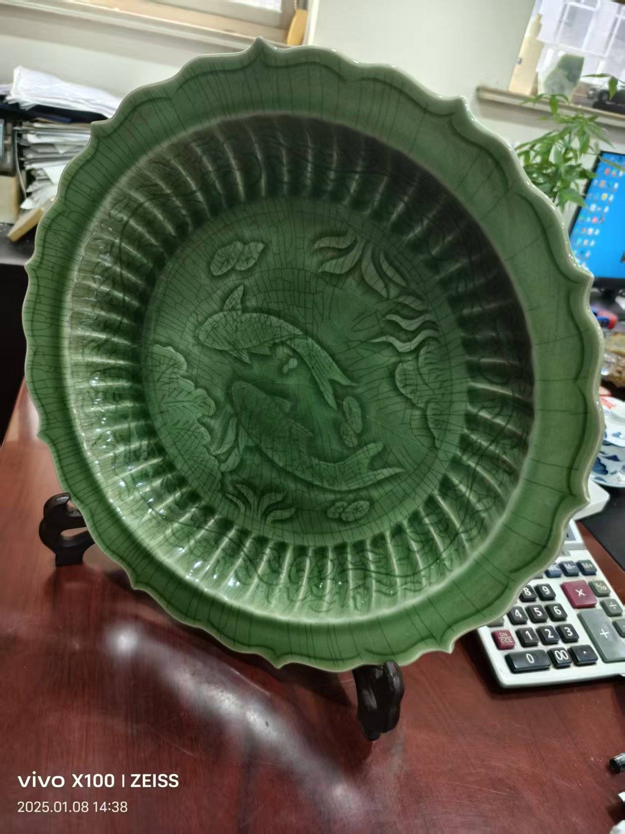 在中国古代陶瓷艺术的浩瀚星空中,龙泉青瓷以其纯净典雅、宛若翠玉的釉色独步天下,成就了单色釉瓷的美学高峰。其中,“龙泉青釉鱼藻纹大盘”以其恢弘的器型、莹润的釉质与生动自然的纹饰,完美诠释了龙泉青瓷的艺术精髓,成为集实用、审美与文化寓意于一身的典范之作,深受历代珍视。