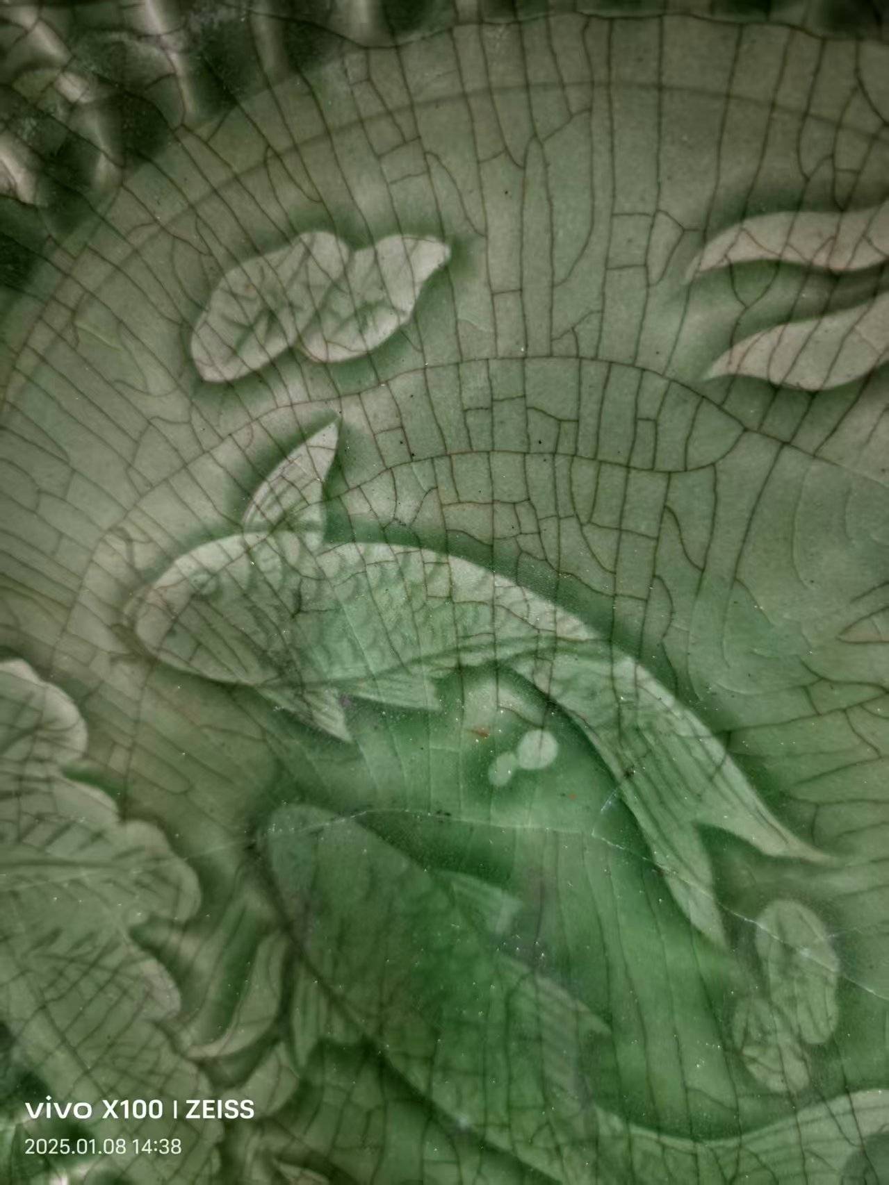 龙泉青釉鱼藻纹大盘,不仅仅是一件餐具或陈设器,它是一汪凝固的春水,是一曲泥土与火焰谱写的青色诗歌。它承载着古老窑火的温度,镌刻着匠人虔诚的匠心,更寄托了世代人们对生活富足、生命繁衍与品格高洁的美好向往。静观此盘,仿佛能见鱼儿在千峰翠色间悠然嬉戏,能感江南春雨般的润泽沁人心脾。它以其永恒的艺术魅力与深厚的文化底蕴,在世界陶瓷史上,永远占据着那一抹最动人的青绿。