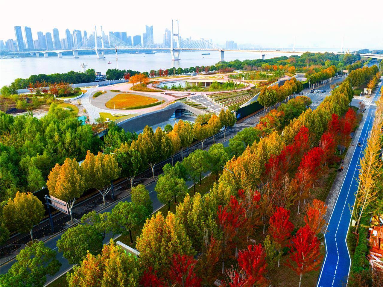 美国红枫以其明艳夺目的“红妆”装点着道路,与高大的法桐那金黄的叶片相互映衬,更与临江大道蓝色的专用骑行廊道串联起这幅美景,骑行其中,仿佛“车从画中过,人在景中游”,沉浸式体验城市浪漫。