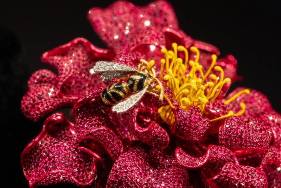 除了珍藏级珠宝,今年V MUSE还首次发布了三款“传世之作”系列高级珠宝新作。其中,“花中之王”牡丹以近8000颗、总重156克拉的缅甸红宝石呈现盛放之姿,精心镶嵌的宝石铺陈出花瓣和花心,底部则用近2000颗、共计19.65克拉的祖母绿构成萼片。停驻在花心的蜜蜂,则是一件诞生于百余年前法国的历史珠宝。