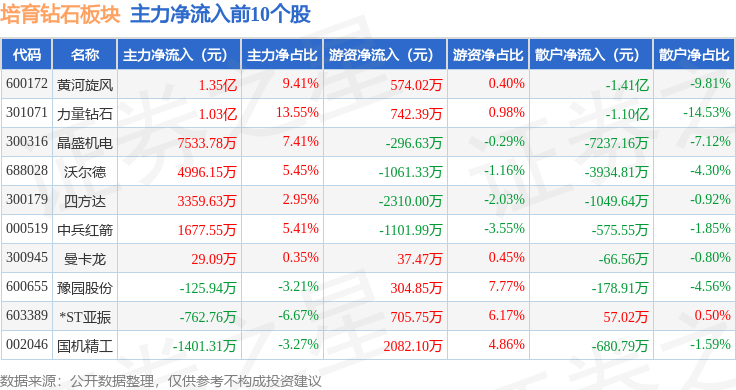 从资金流向上来看,当日培育钻石板块主力资金净流入1.05亿元,游资资金净流出3336.77万元,散户资金净流出7181.42万元。培育钻石板块个股资金流向见下表: