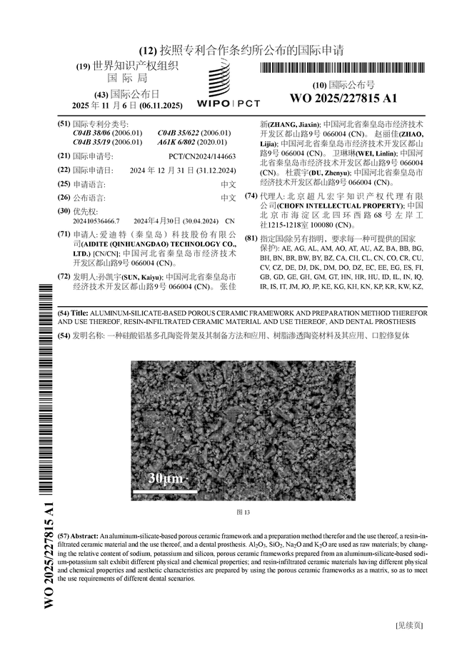 证券之星消息,根据企查查数据显示爱迪特(301580)公布了一项国际专利申请,专利名为“一种硅酸铝基多孔陶瓷骨架及其制备方法和应用、树脂渗透陶瓷材料及其应用、口腔修复体”,专利申请号为PCT/CN2024/144663,国际公布日为2025年11月6日。