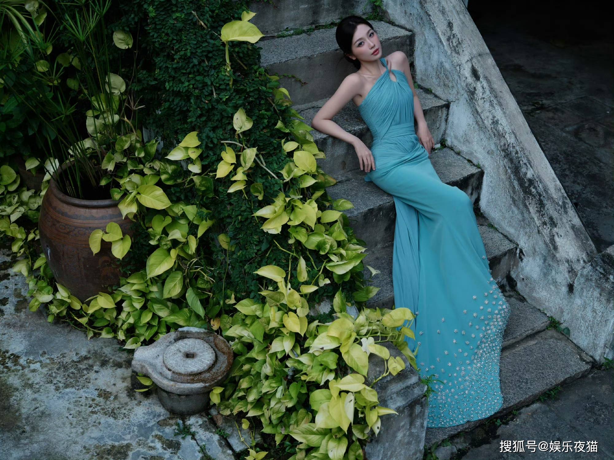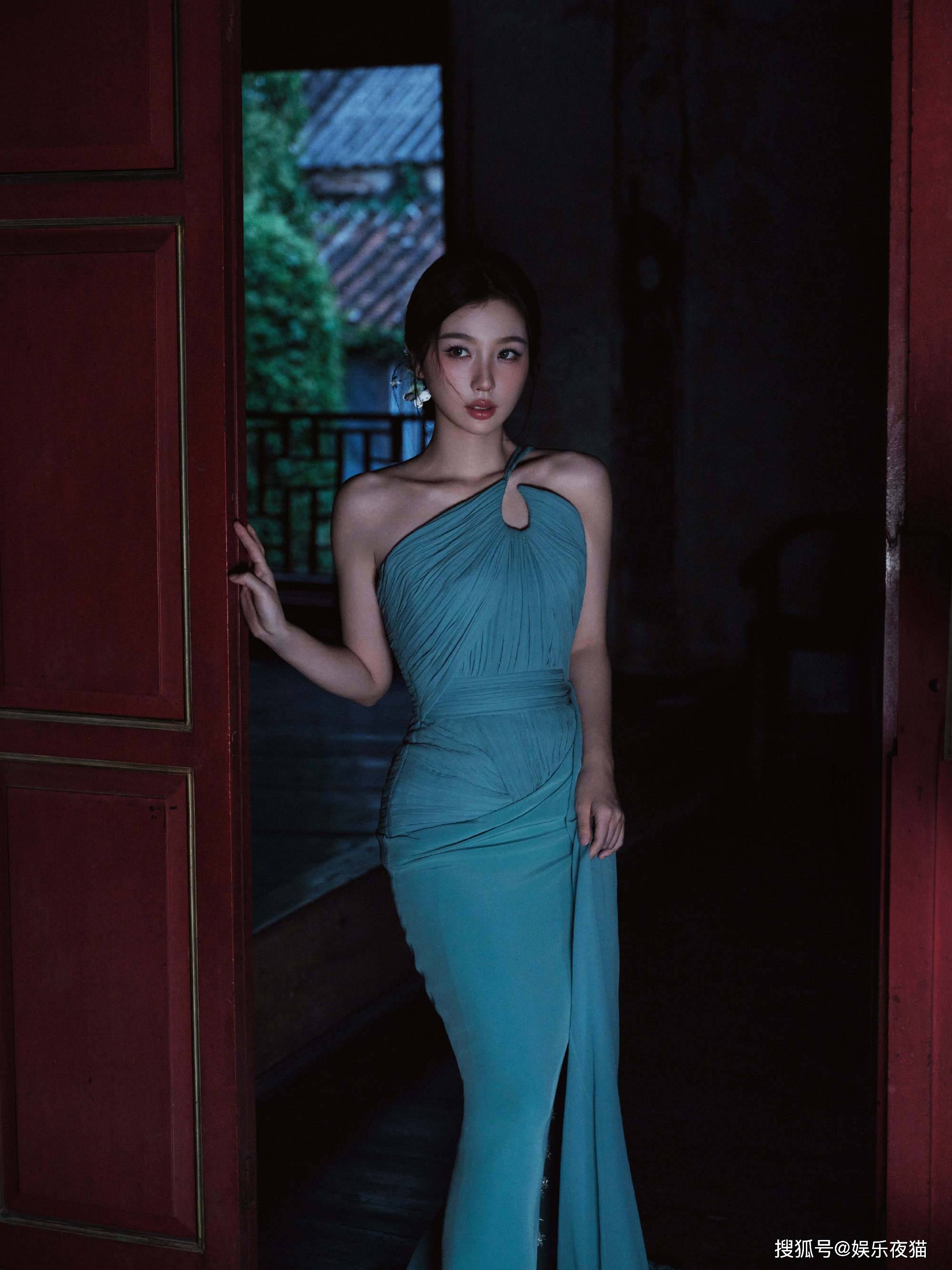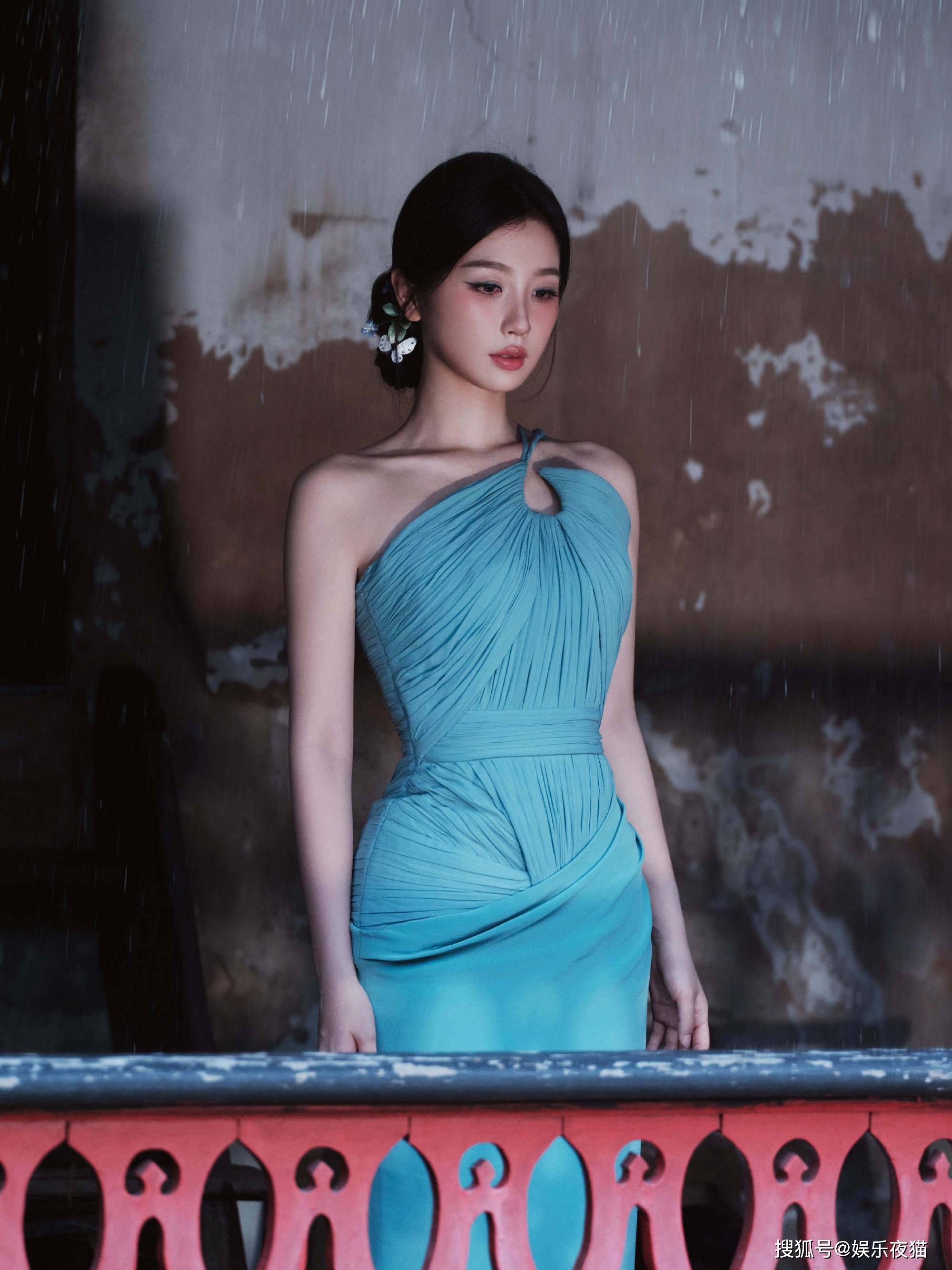 虞书欣身穿蓝色斜肩裙写真气质清冷飘逸
