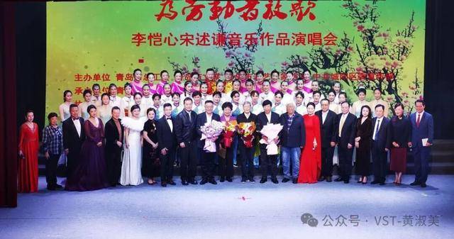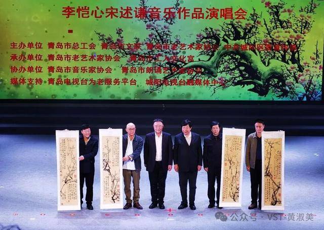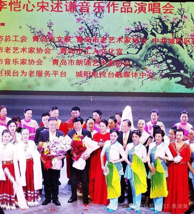 演出过程中还设置了多个温情互动环节。主持人王雷、王利邀请词作者:青岛市文联原党组书记、主席、青岛市文联名誉主席、青岛市老艺术家协会名誉主席李恺心、曲作者笔名:欢歌,中国音乐文学学会会员、中国音乐著作权协会会员、山东省音乐家协会会员、山东省朗诵艺术家协会会员、青岛市音协、青岛市朗协会员、青岛市老艺术家协会会员、青岛市城阳区音乐家协会顾问宋述谦老师登台,两位老友深情分享了多年来合作的珍贵友谊,以及每首作品背后源于生活、扎根劳动的创作初衷,朴实无华的话语赢得现场阵阵掌声。李恺心主席、宋述谦顾问分享了自2014年起,连续五次获得青岛市“海燕杯”原创音乐作品一等奖,歌曲《泡桐花又开》和《小调汇成大交响》等荣获山东省、全国新创歌曲大赛特等奖。宋述谦顾问语言朴实低调。据悉:《小调汇成大交响》《泡桐花又开》等作品被人民网、新华网、光明网、大众网、青岛电视台等媒体都先后对作品做过专题介绍,大有一鸣惊人之感。李恺心主席则分享了他与宋述谦老师都是城阳生人,他们的童年是在白沙河的流水和黄埠岭的庄稼伴随走过来的,故乡对他们来说,绝不是一句“生我养我”的话所能概括的,他们对家乡的一草一木、一缕炊烟、一声蝉鸣、一曲秧歌、一台柳腔,都有着刻骨铭心的记忆和深情。《泡桐花又开》《小调汇成大交响》《沧海横流显英雄》《我心依然飞翔》等今天演唱的十五首歌曲都是俩人合作的结晶,艺止无境,路途漫漫,不懈追求是连结的毕生梦想。是啊,整场演唱会摄人心魄,使人感受到清新的旋律沐浴花海,融入奔腾的江河,迸发时代的强音。李主席、宋顾问两位音乐艺术家朴实无华的语言赢得了大家阵阵掌声!随后的赠予书画艺术作品环节,欣赏四幅大气磅礴的书画作品令人眼前一亮。敬献的鲜花环节,都是岛城爱好者,自发敬献给德艺双馨值得尊敬的李主席与宋顾问的满满崇敬心意。以书画寄情、以鲜花表意,向两位创作者致以最诚挚的敬意,更将音乐会气氛推向高潮!演出最后,全体主创、演职人员与嘉宾合影留念,定格下这一凝聚热爱与敬意的珍贵瞬间。