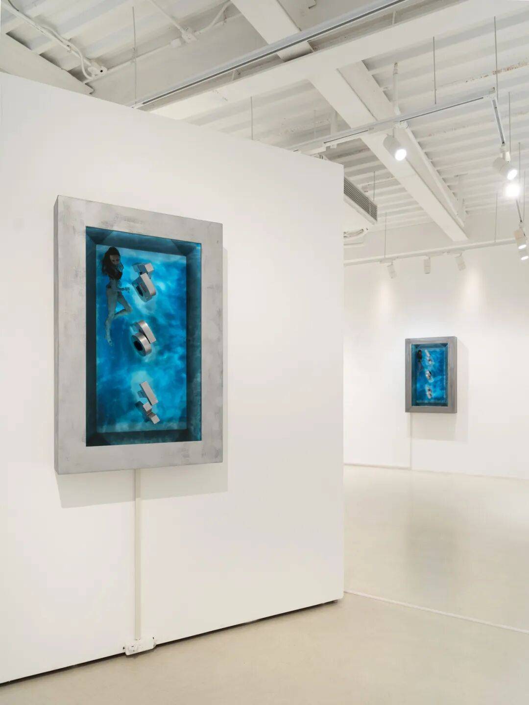 本次展览呈现马克以水为核心的经典与最新作品,其中经典作品《逆流》(Gegenstrom)通过女性在水中的身体动态,表现出生存的意志与无法摆脱的束缚,透过动作延长时间,让观者感受到生命的脆弱与不屈;新作《居于深度的正方里》(Living in a deep square)中的女性漂浮于狭小方格,被空间局限导致无法伸展的肢体隐喻多重的社会规范。作品《长管》(Long Tube)中来回游泳的女性似被囚禁,带有窥视性的观看引领不安的思绪,像是帮瓶中女性或自身情绪找寻出口。这些作品共同建构了一个水的哲学剧场,将录像与雕塑交织成在场体验,观者不再是单纯的观看者,而是与作品同场共振的参与者。
