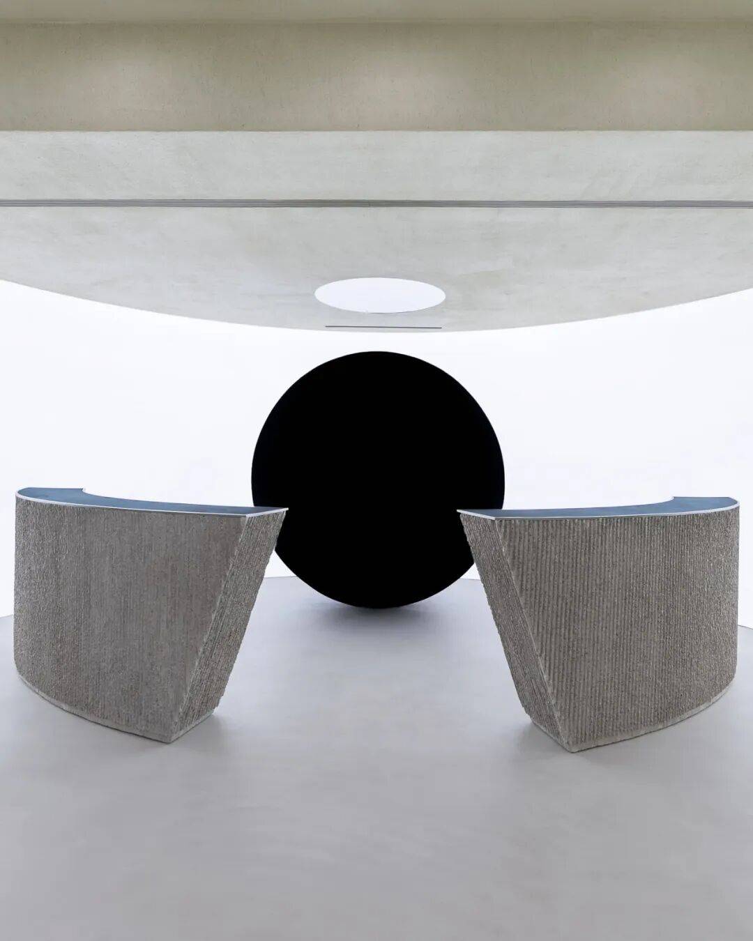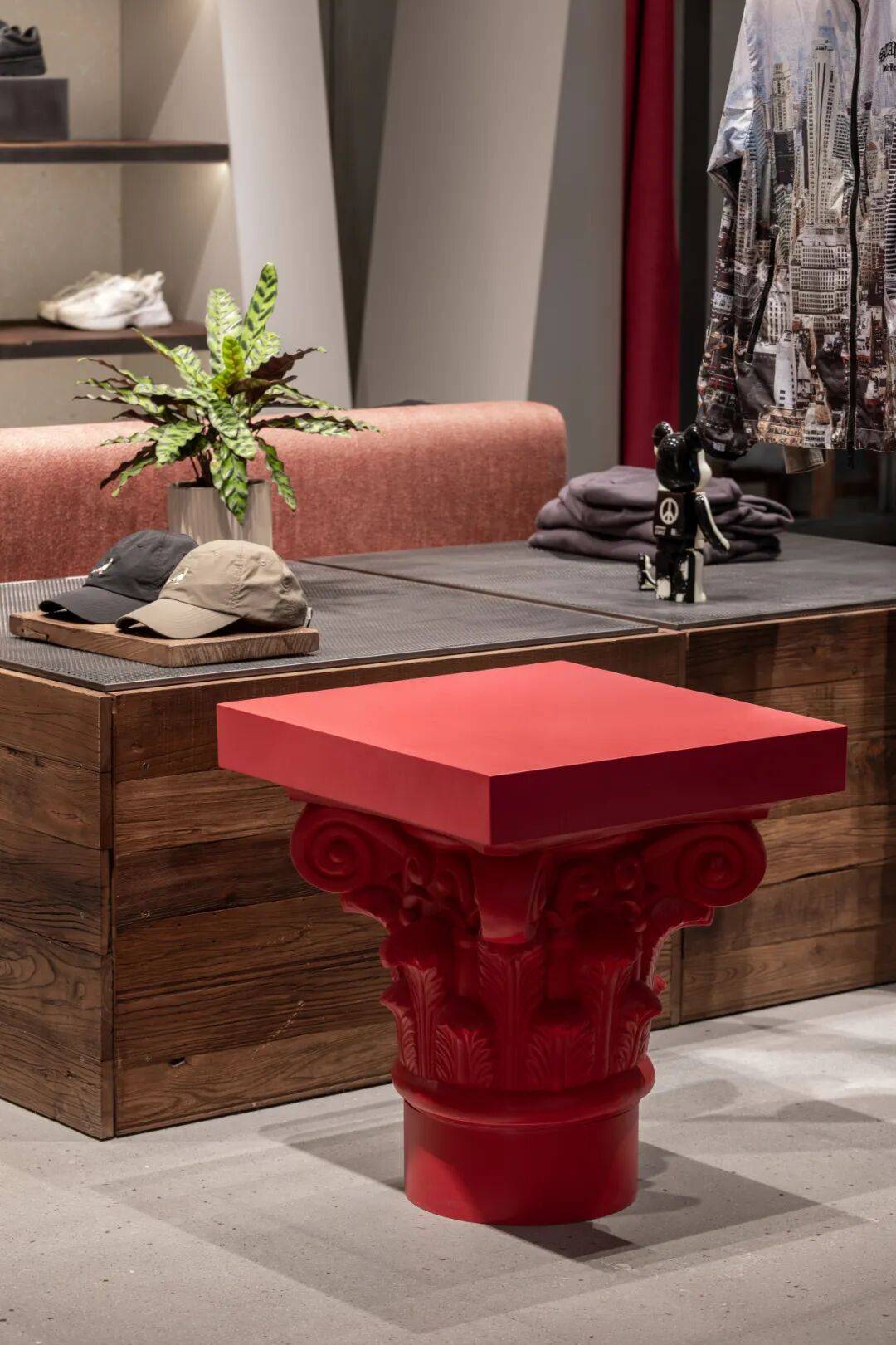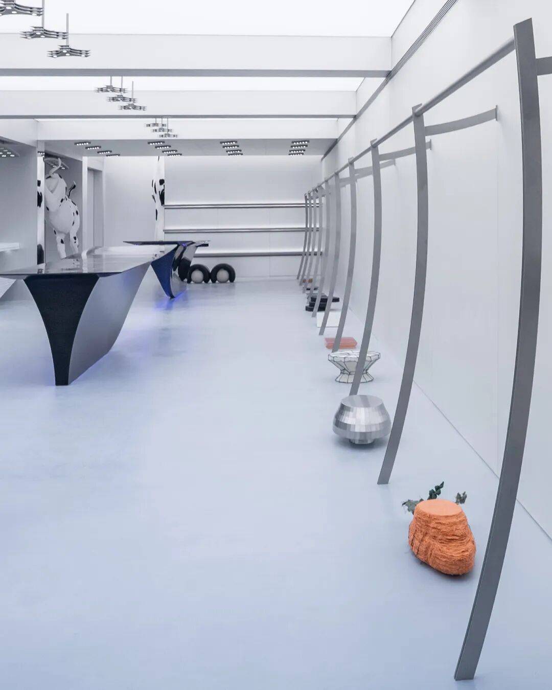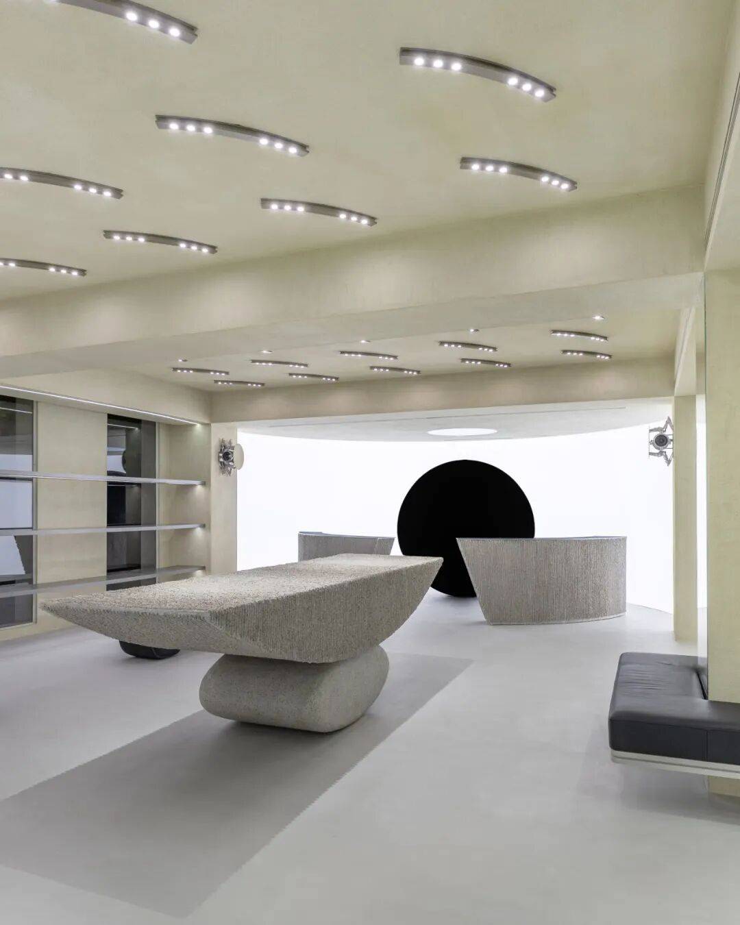 空间一层以“后极简主义”为核心理念,通过直线与曲线的组合及多元材质平衡展现创新设计。特邀五位艺术家打造的特色展示台运用混凝土、树脂、贝壳母等对比材质,突破传统工业美学界限。二层设有当代支线Significant Shanghai与配饰集合店Ov Shop,结合餐饮品牌POD RITUAL及生活方式品牌AOESAK,共同构建五大品牌联动的“超空间”生态。