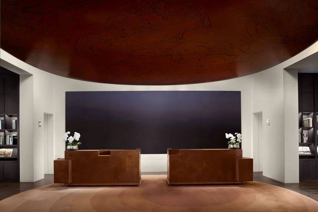 门廊被设计为连接城市与室内宁静的过渡空间。这是张力与舒展交织的瞬间,预示着即将展开的体验。蜿蜒步道引领宾客穿过系列浅水池,其设计灵感源自住宅花园的风格以及千代田区的地形特色。从一楼抵达30层,进入大堂区域。定制木质屏风构成的视觉脊柱贯穿整个抵达动线,在空间与材质层面实现连贯。在大堂酒廊和Le Cres糕点吧,Yabu Pushelberg设计的家具与装置在每个转角都带来独特体验,客房则以流动的现代主义为基调。